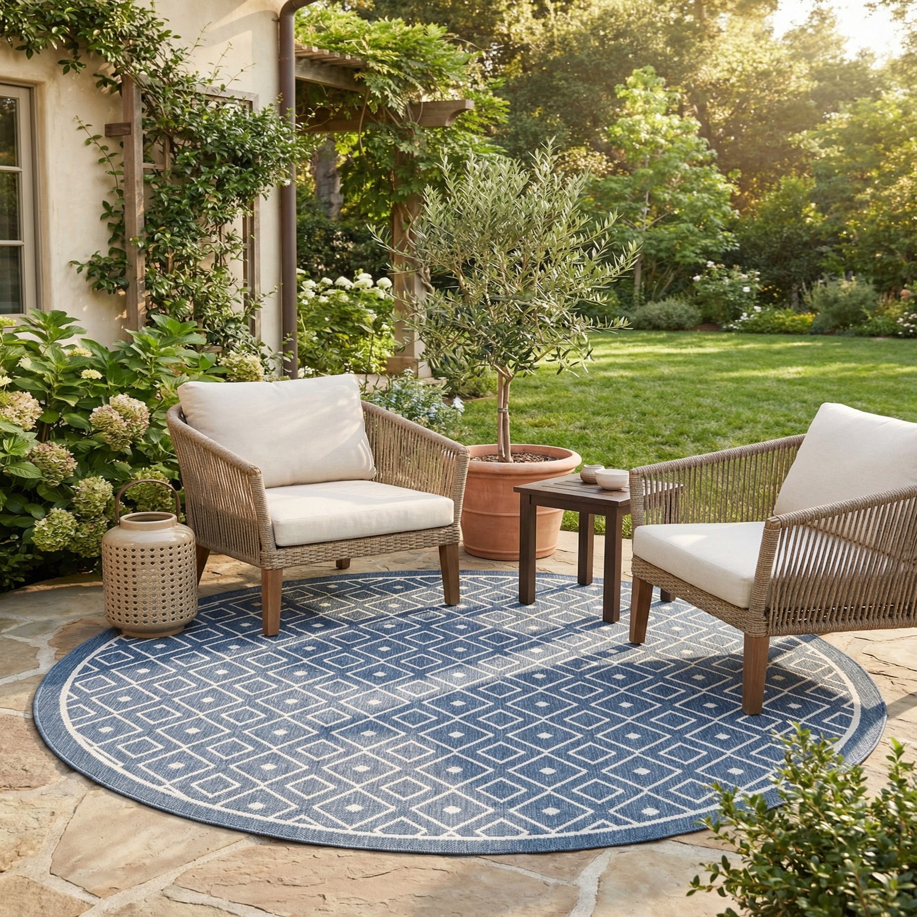 This round design works well outdoors and in covered-transition spaces — think a covered patio, sunroom, or balcony dining nook — and also fits indoor settings that favor casual, coastal, or modern farmhouse styles. Pair it with wicker or painted-wood furniture and linen cushions for a relaxed porch, tuck it beneath a round bistro table on a balcony, or use it to ground a small seating area in a beachy living room. The navy and ivory palette makes it easy to layer with neutral tones or brighter accents.