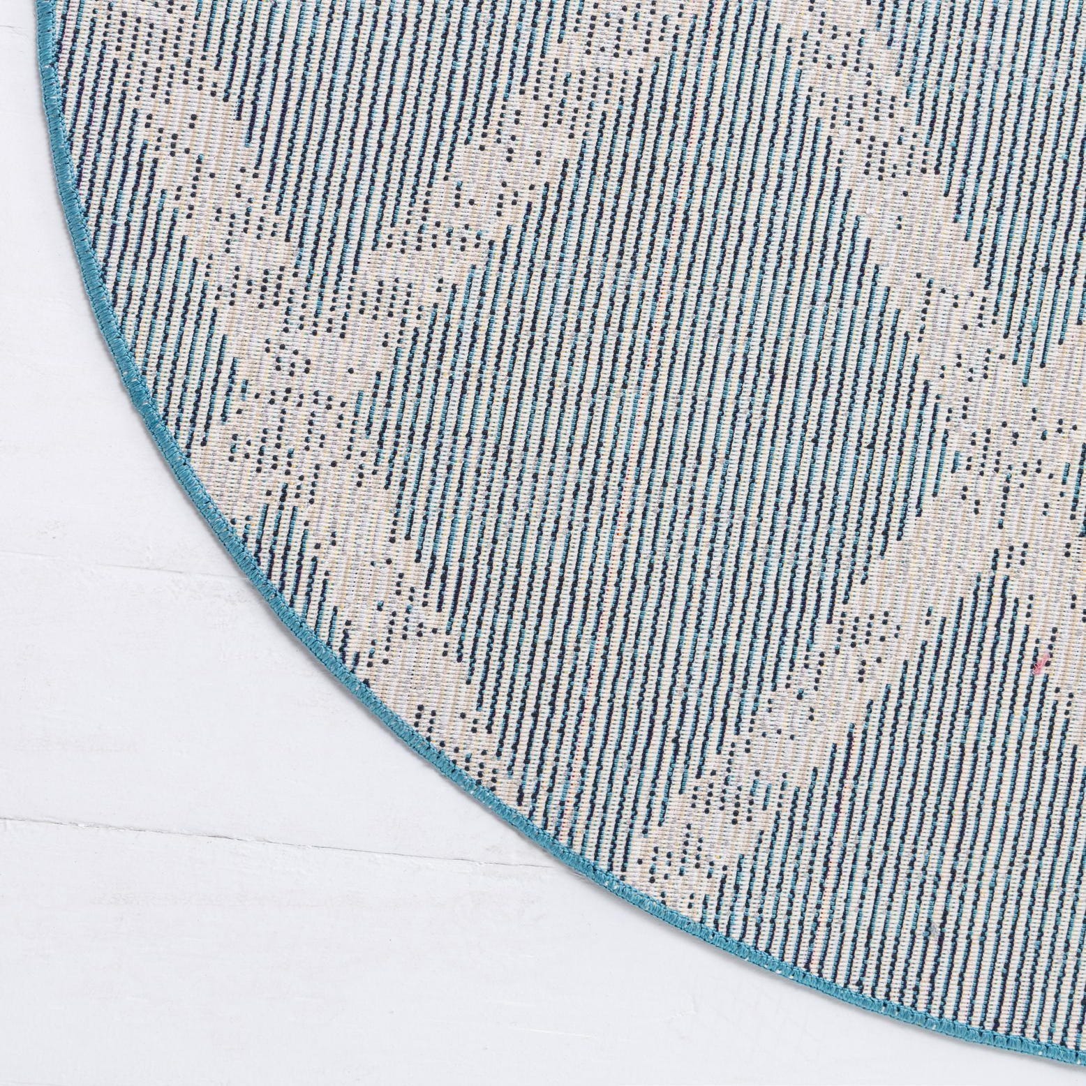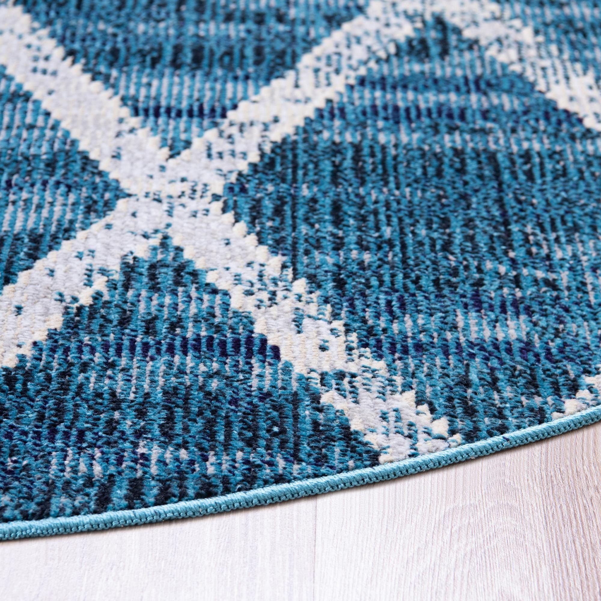 A round 7' 0 x 7' 0 blue rug with a modern white diamond trellis pattern and textured pile.