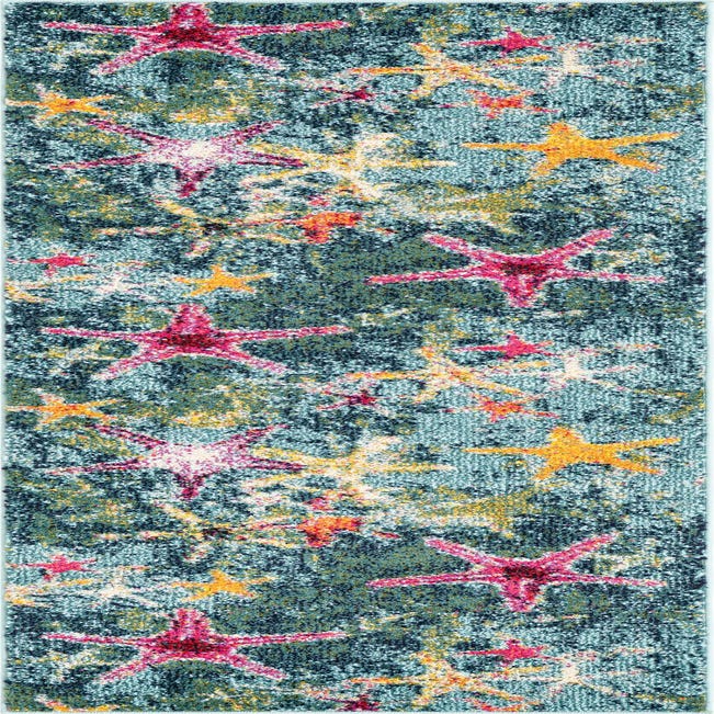 A 7 ft runner rug featuring a vibrant coastal pattern of pink, yellow, and orange starfish on a textured blue background, ideal for a hallway.