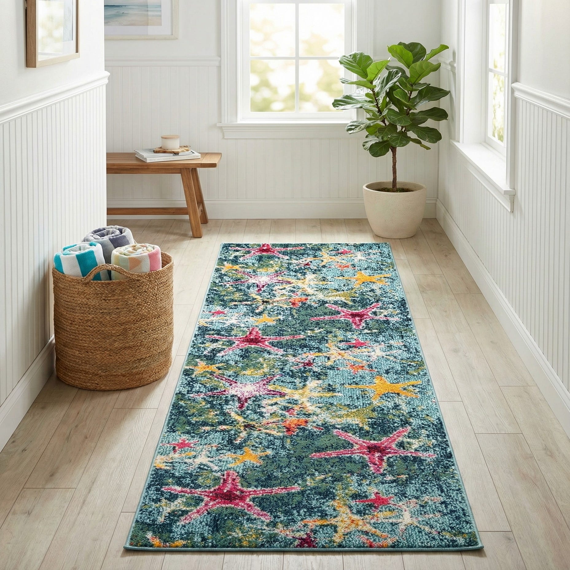 Machine-made from 100% polypropylene, the rug has a dense low-to-medium cut pile that feels soft underfoot and shows a subtle, light-catching sheen. The textured surface highlights the multicolor pattern and gives the piece tactile interest beneath bare feet. Ideal as a hallway or entry runner, it also works well at the foot of a bed, along a kitchen galley, or as a colorful accent in a mudroom or children's space. It pairs beautifully with natural woods, rattan or wicker, crisp white trim and brass or aged-metal accents for a relaxed coastal or eclectic interior.