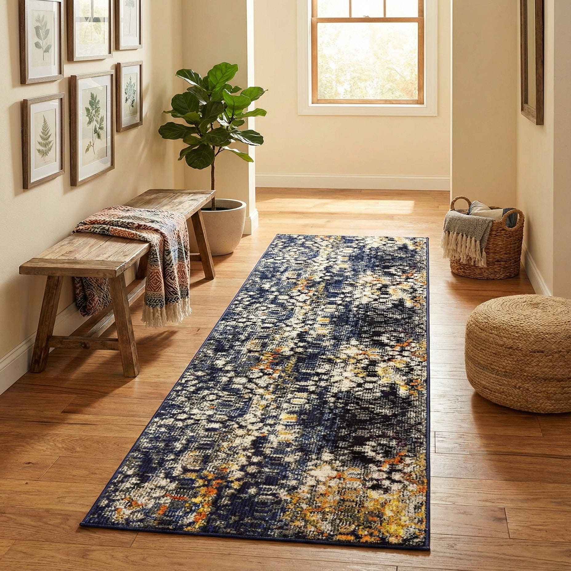 Designed as a runner, this piece fits hallways, entryways, narrow kitchens or the side of a bed. It pairs well with warm wood tones and brass or bronze hardware to highlight the amber and ochre accents, or with cool grays and navy upholstery for a layered, modern palette. The mix of texture and color also complements industrial and transitional schemes—use it to soften concrete floors or to add visual interest in a minimalist corridor.