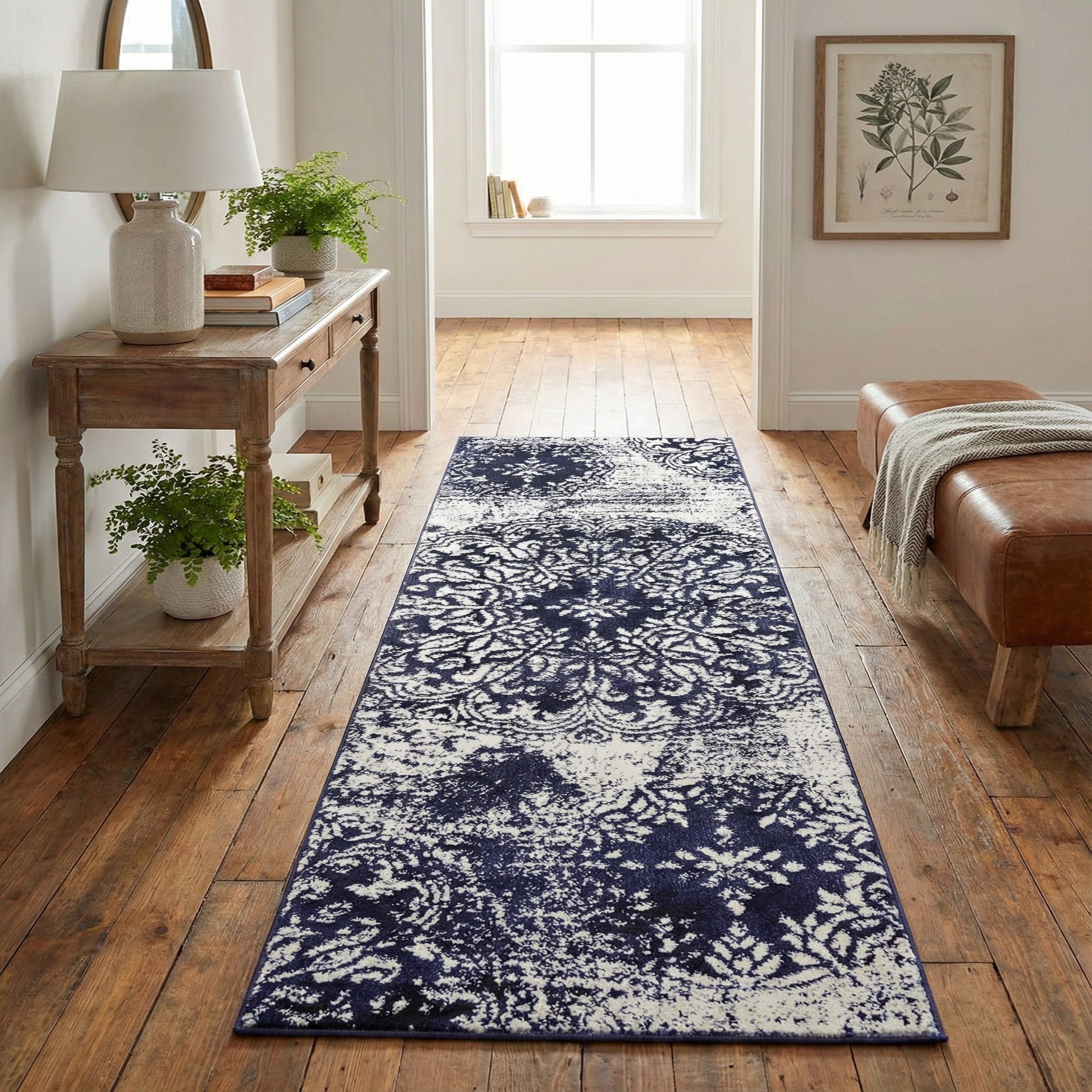 Primary color is Navy Blue. Colors in this rug include: Navy Blue, Ivory.