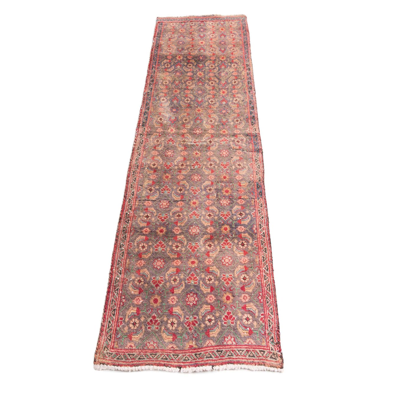 A 7 ft runner rug in a vintage Persian style, featuring faded blues, reds, and creams, ideal for a hallway.