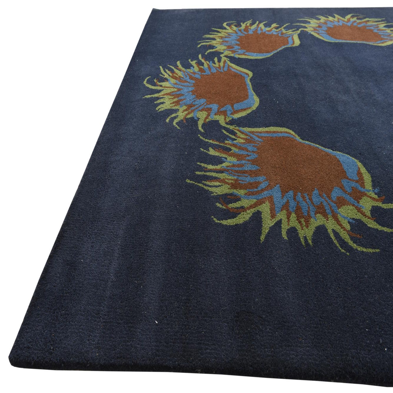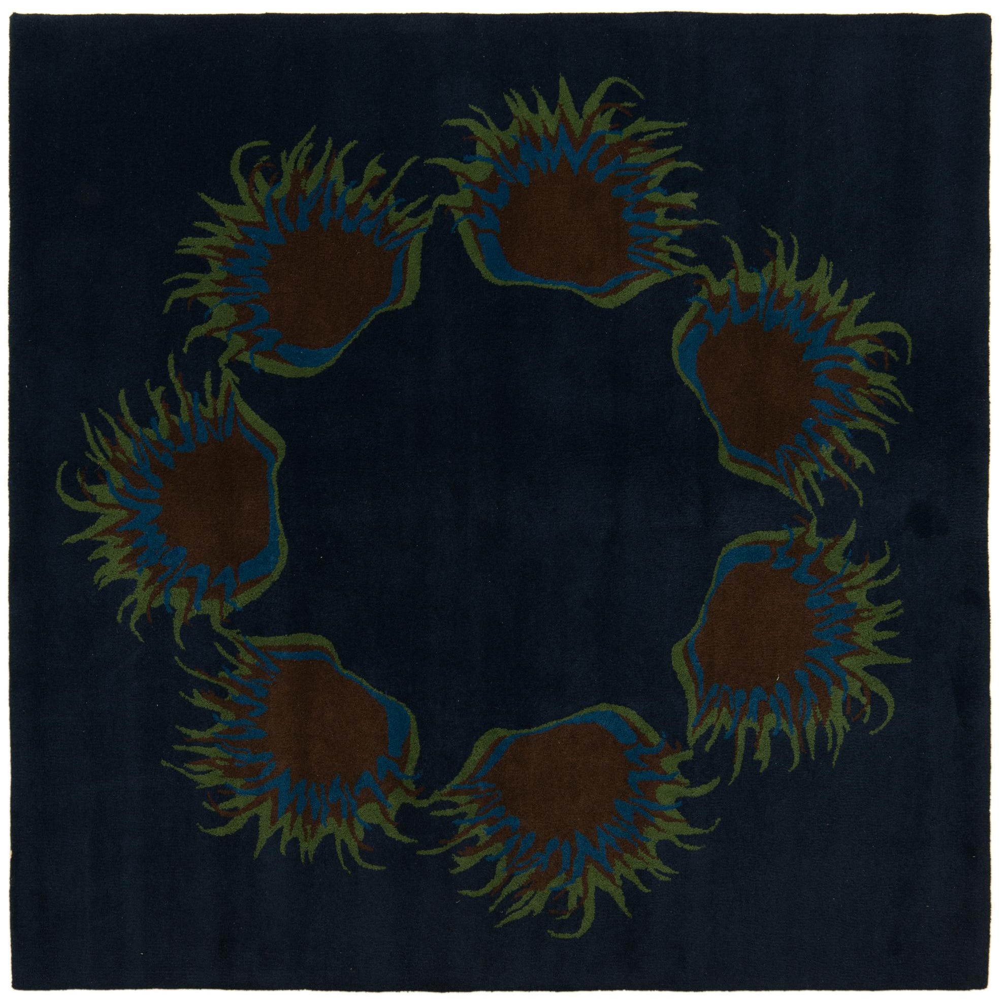 A 7' 4 x 7' 4 square navy blue modern wool rug with a circular pattern of abstract brown, green, and blue floral shapes.