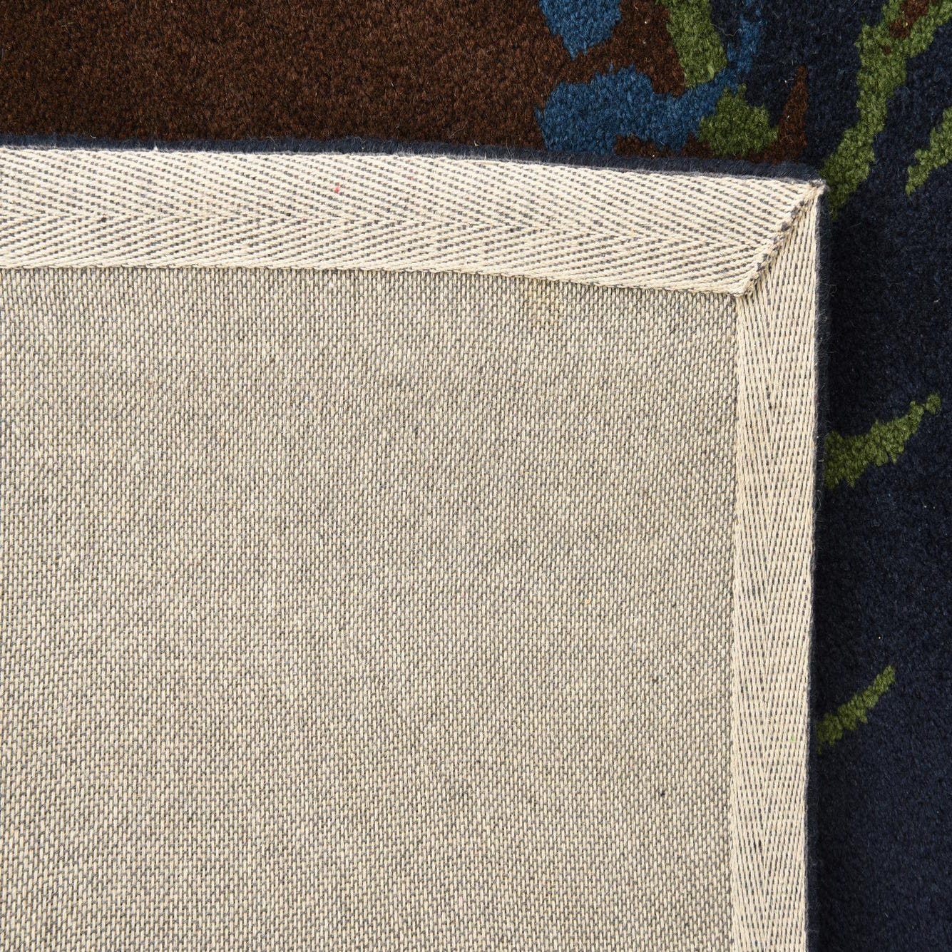 This Agra Collection rug presents a harmonious blend of traditional artistry and contemporary styling, hand-tufted from a mixture of wool and cotton. The rug spans 7 feet square, a size that commands attention in the right setting. The pattern features an array of stylized floral motifs, which offer a crisp contrast against the deep navy blue background. Accents in blue, brown, and green add a muted yet vibrant palette that can easily integrate into various design schemes.