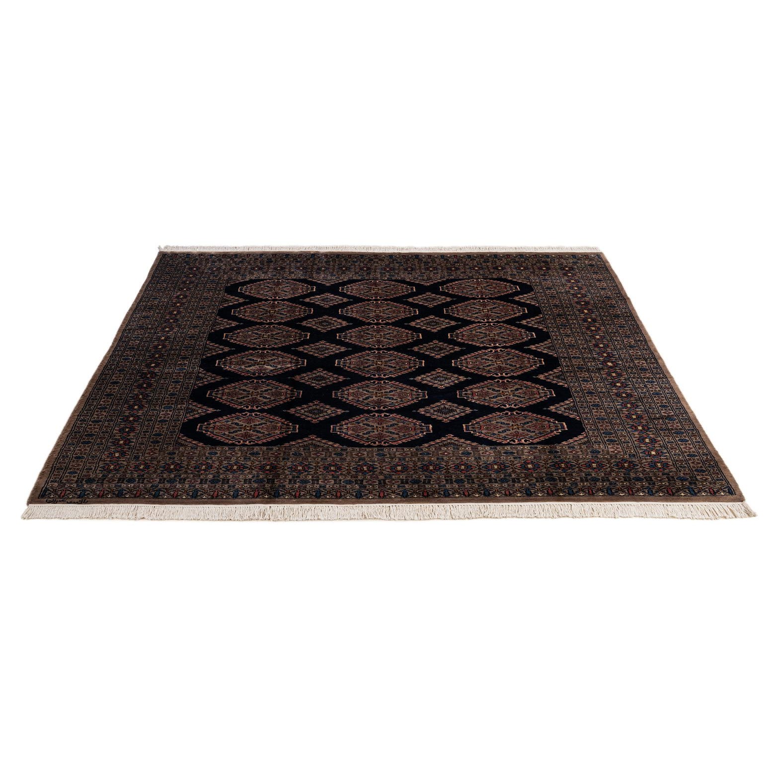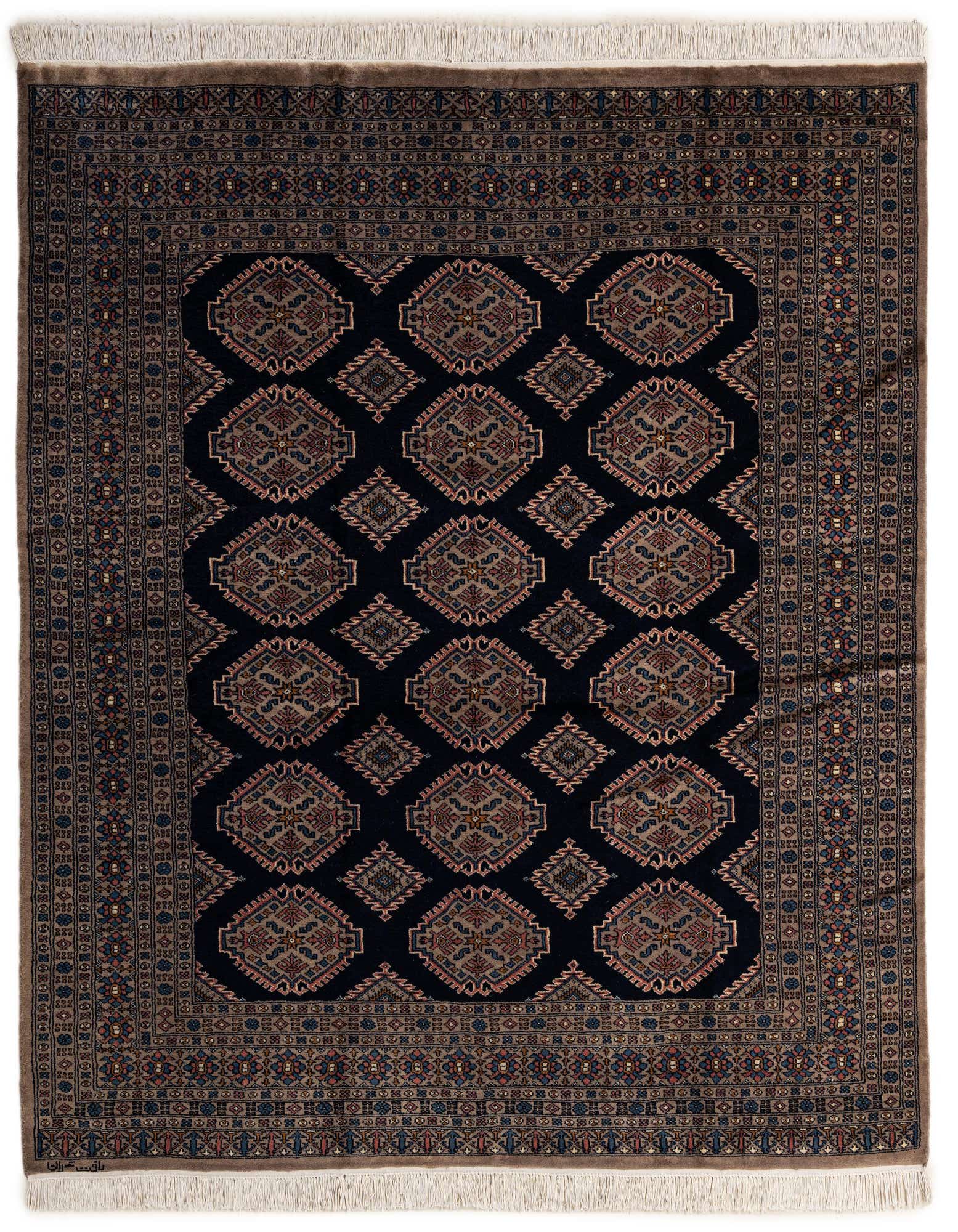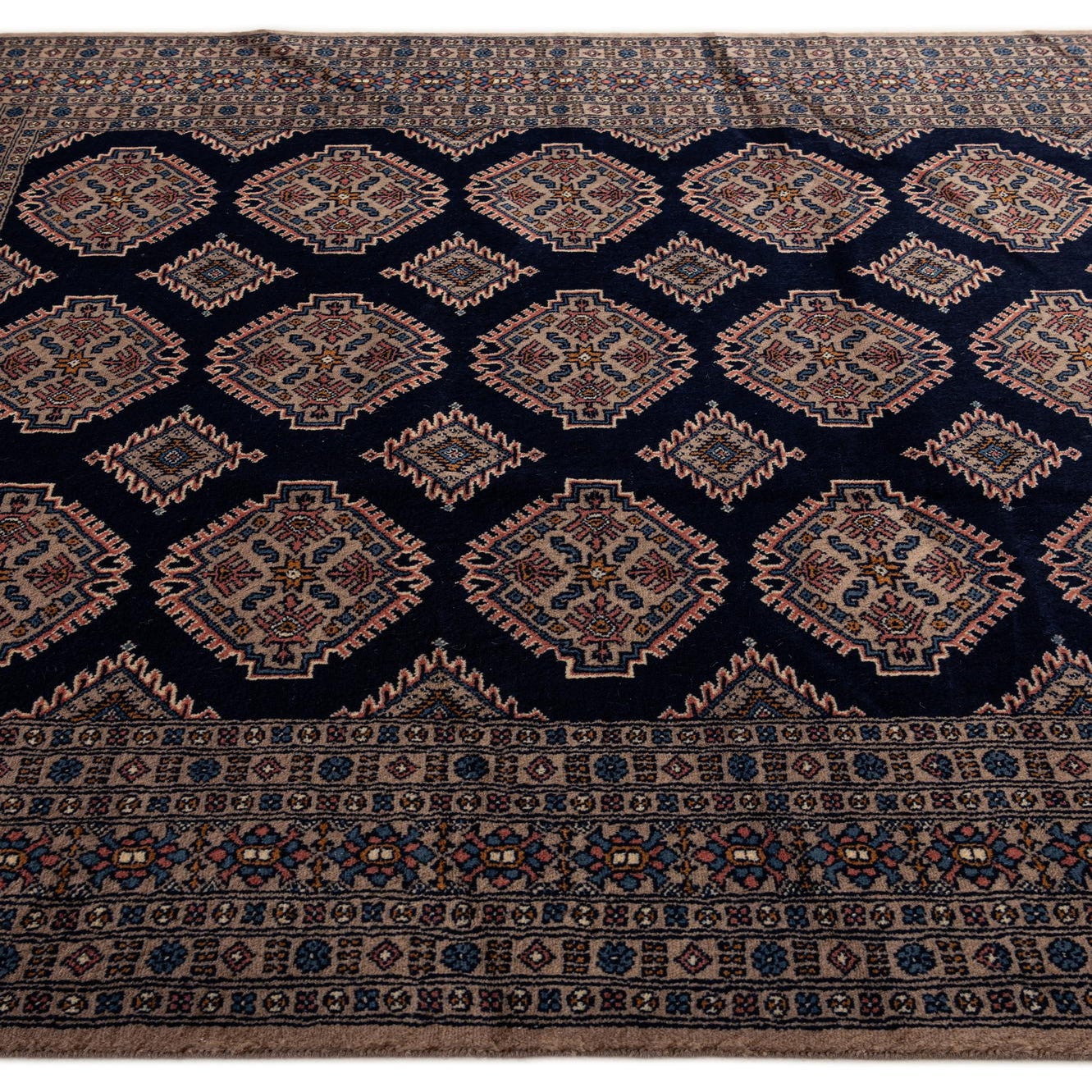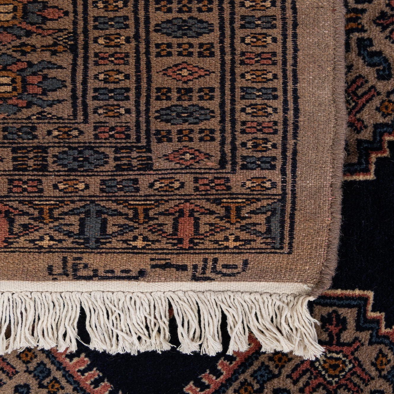 A square, handmade Bokhara wool rug with a navy blue field and intricate tribal, oriental patterns in blues, browns, and reds, featuring a detailed border.