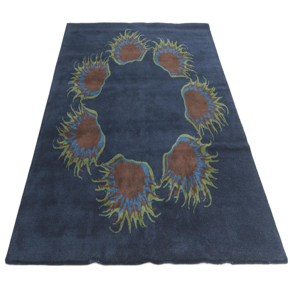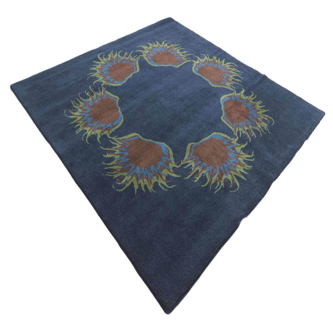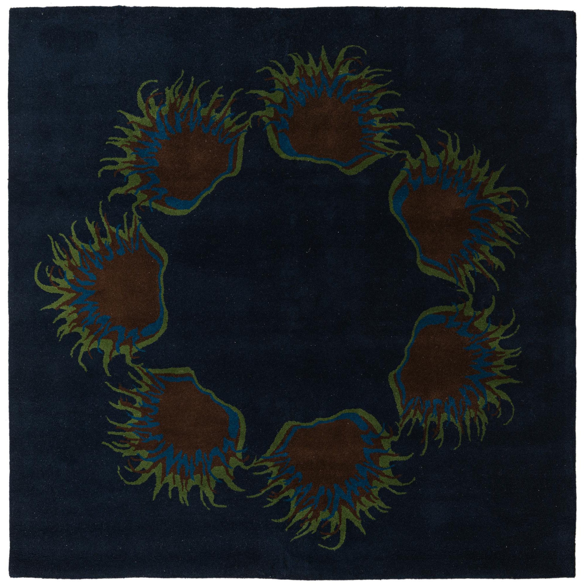 A square navy blue rug with a circular modern floral pattern in brown, green, and blue, perfect for an indoor living space.