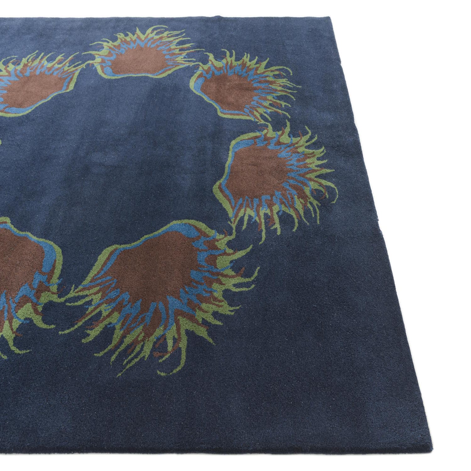 The Luna Collection offers a unique, hand-tufted square rug crafted from a blend of wool and cotton, providing both durability and a soft texture underfoot. This 7-foot square rug features a rich navy blue background, accented with a pattern of organic shapes in coordinating shades of blue, brown, and green. The design suggests a natural motif with hints of floral or sunburst elements, articulated through a contemporary lens.