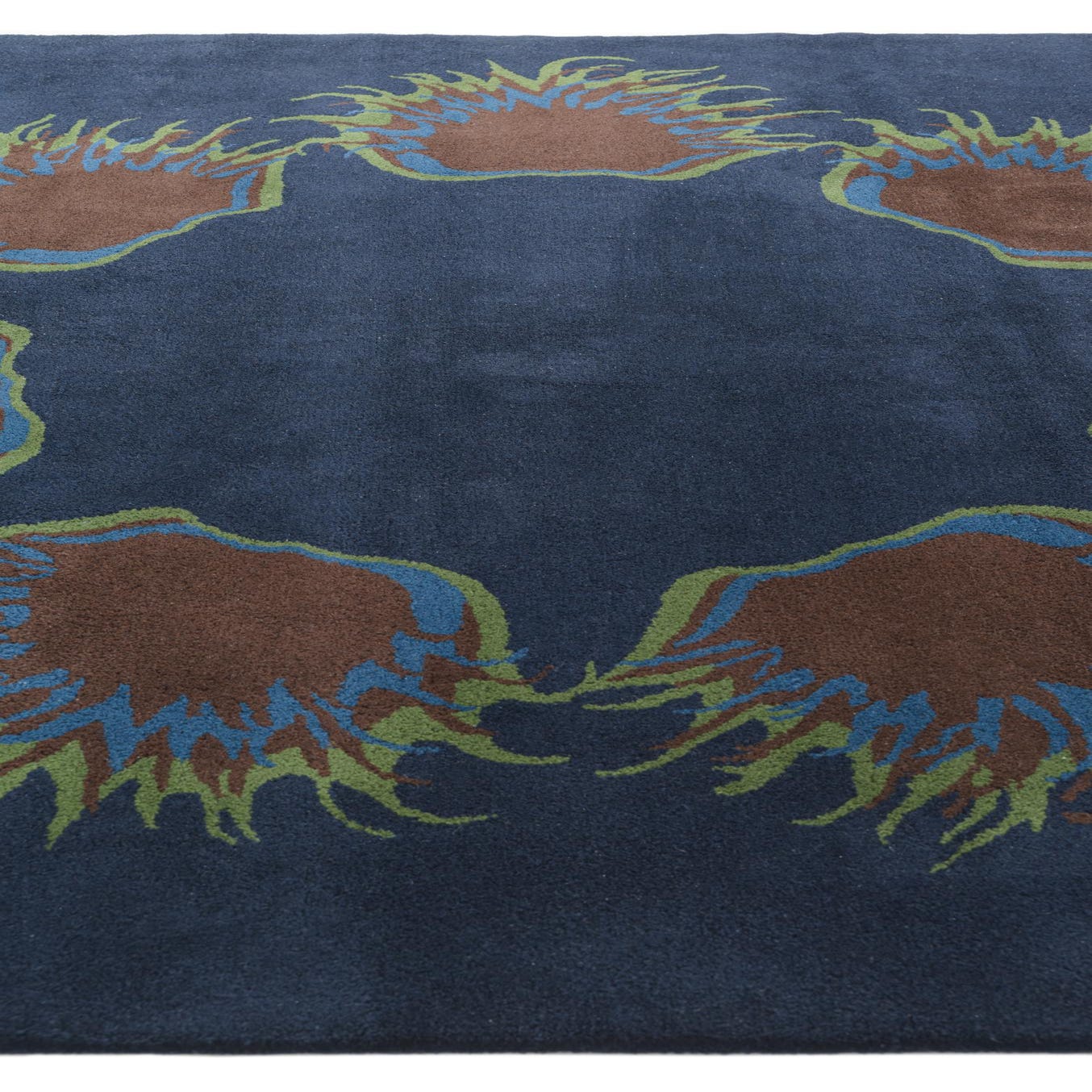 The deep, navy blue base of the rug serves as a versatile foundation, making it an excellent choice for a variety of interior design styles. The juxtaposition of the warm brown tones with the cooler blues and greens allows this rug to bridge the gap between cooler industrial aesthetics and warmer, earthy interiors. It can anchor a reading nook with its inviting texture, complement a modern living space with its clean lines, or add a graphic statement to a minimalist decor scheme without overwhelming the space.