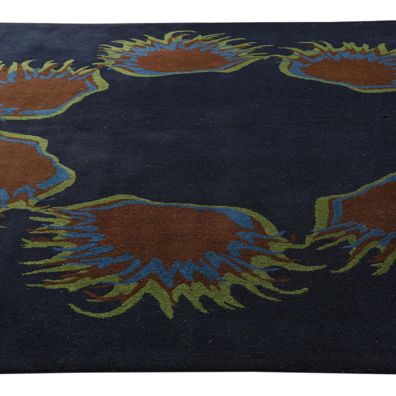 A square navy blue wool and cotton rug with a circular modern floral pattern of brown, blue, and green shapes.