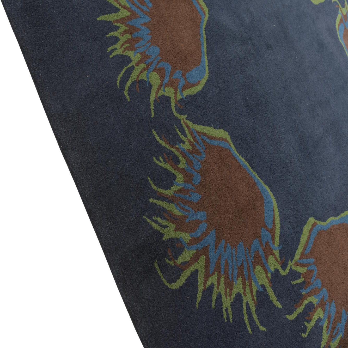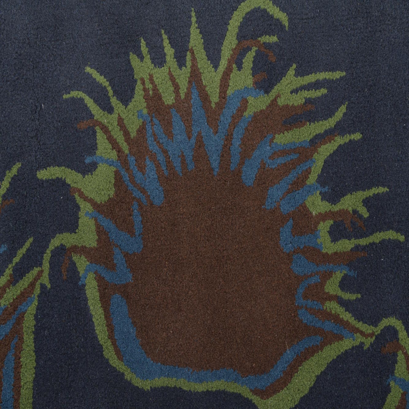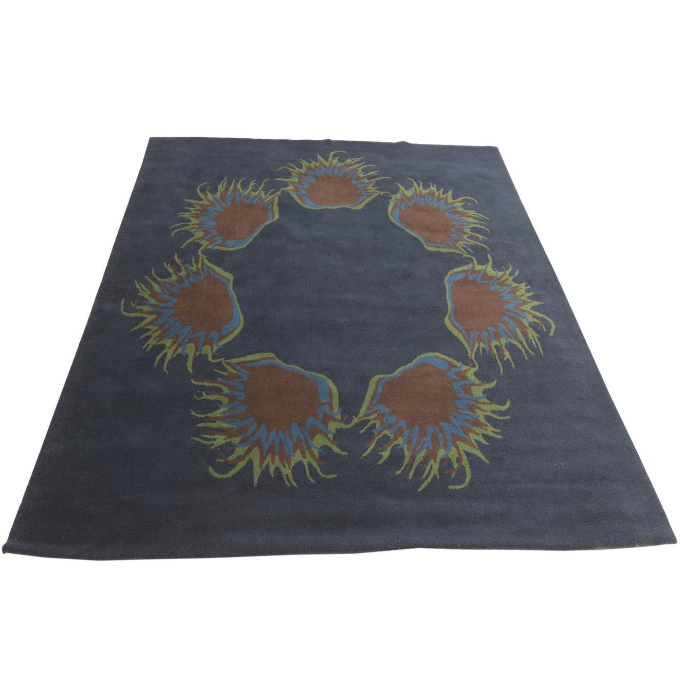 A 7' 5 x 7' 5 square navy blue rug with a circular modern floral pattern in brown, blue, and green.