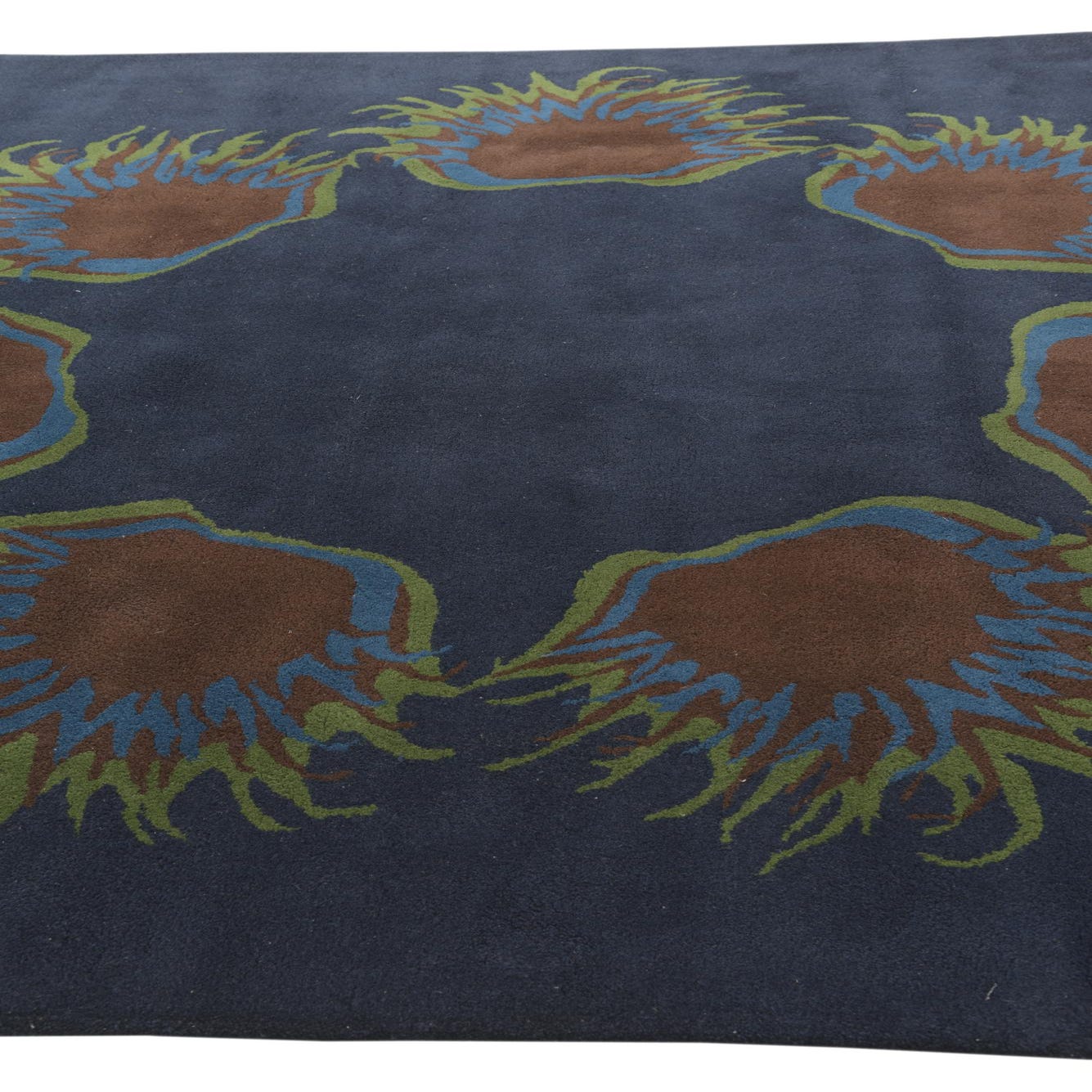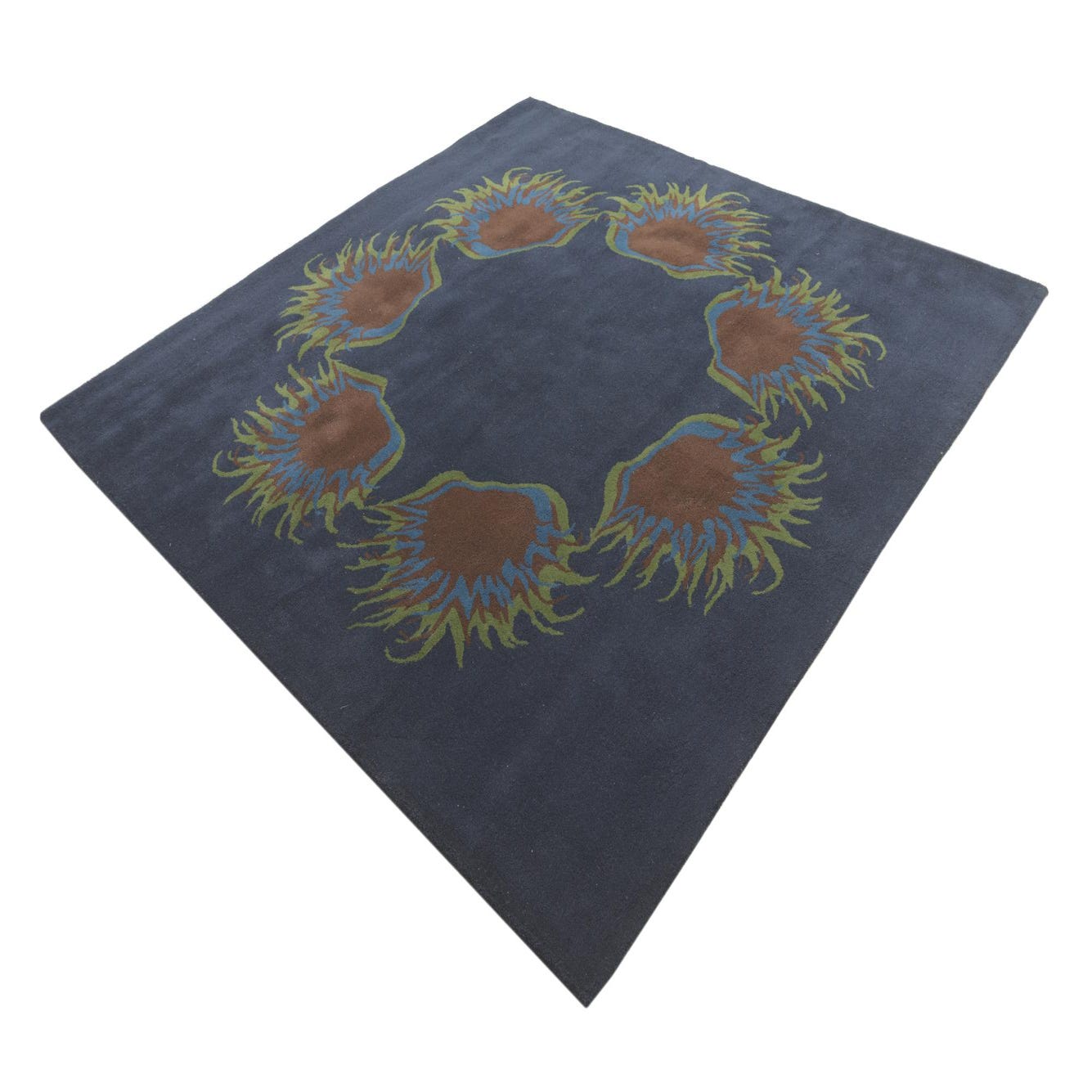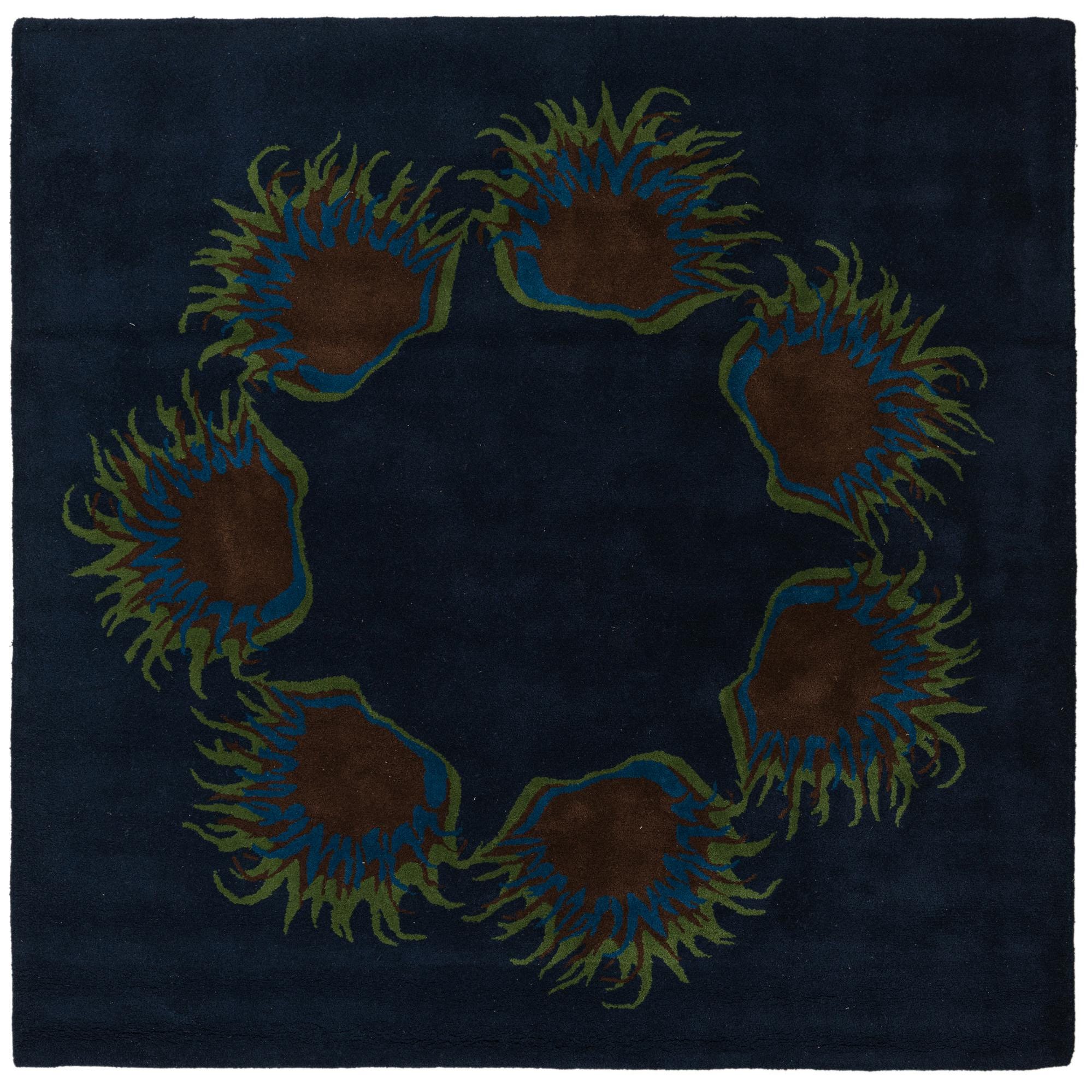 A square navy blue rug with a circular floral pattern of brown, blue, and green botanical shapes.
