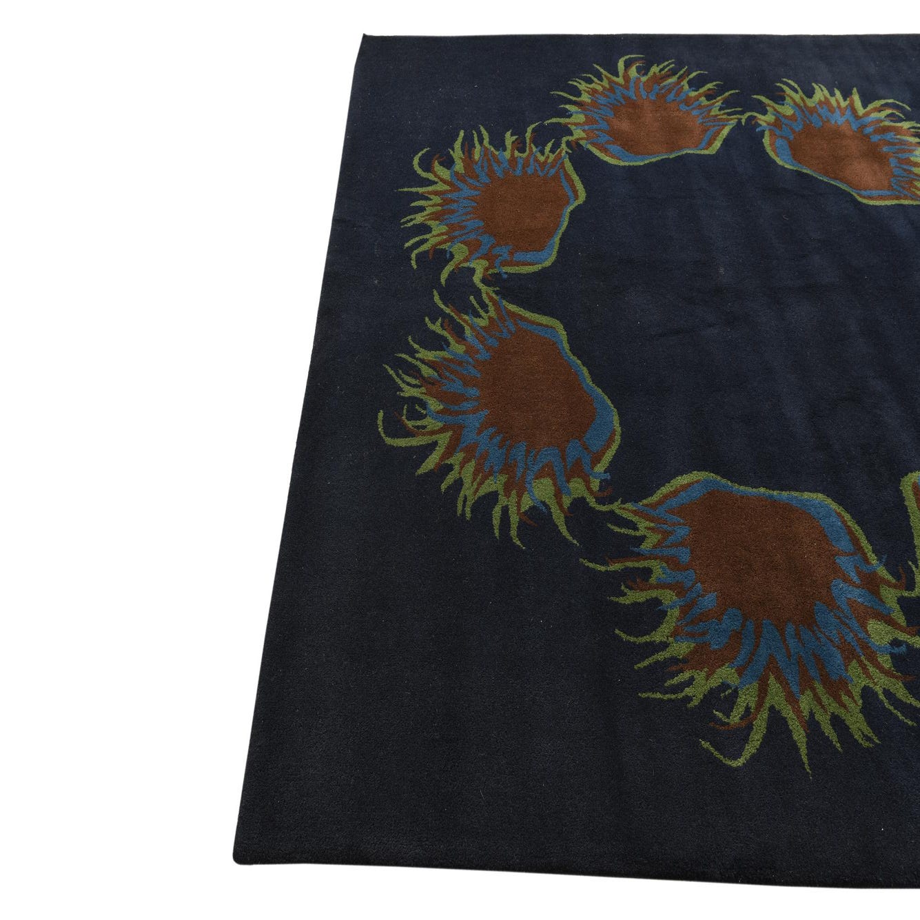 A square navy blue rug with a modern, circular pattern of brown, blue, and green abstract floral shapes.