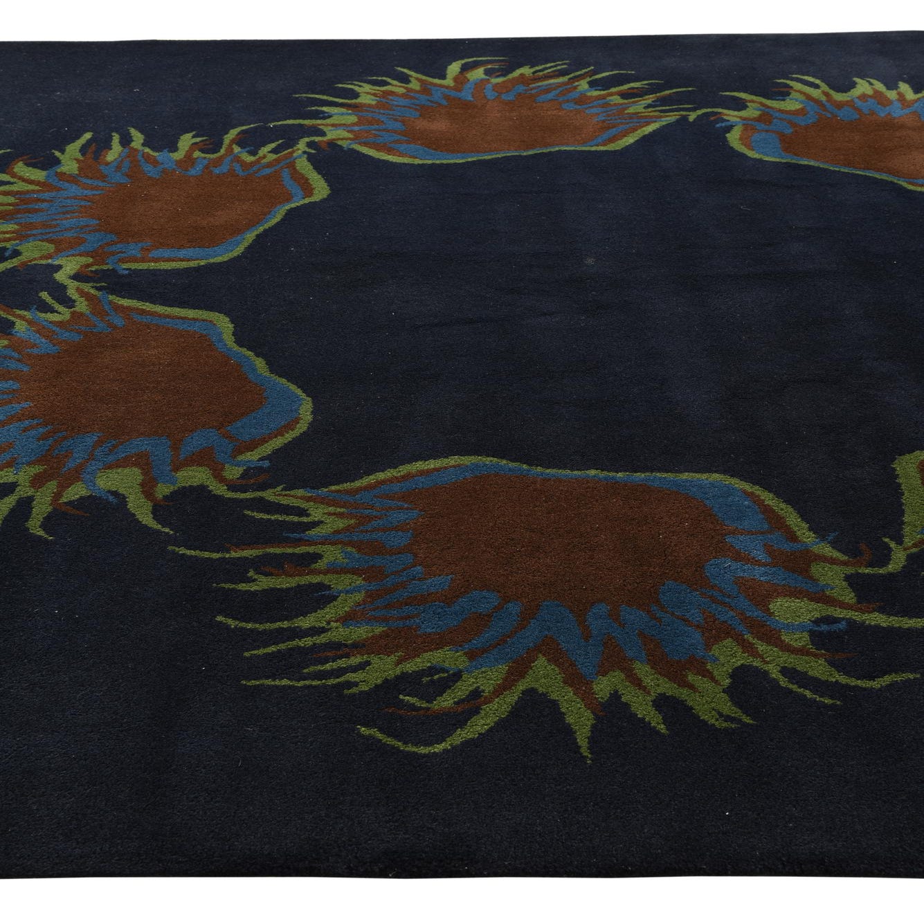 A deep navy field creates a calm, grounding backdrop for a ring of organic, sunburst-like motifs. Each motif has a warm brown center edged in layered blue and green tendrils, the shapes arranged in a near-circular formation that leaves the center of the rug uncluttered. The overall effect is contemporary with an organic, almost marine-inspired character—graphic yet naturally flowing.