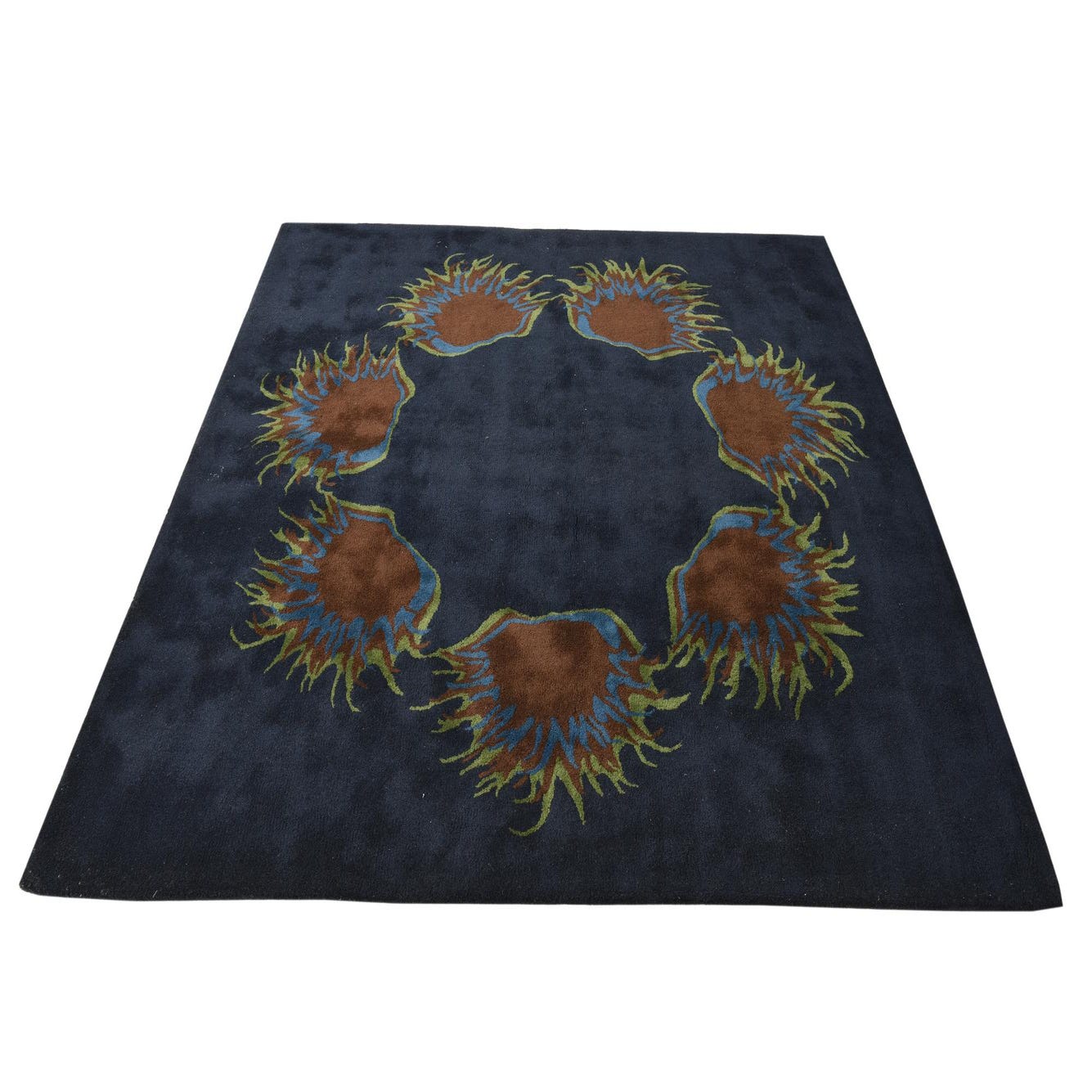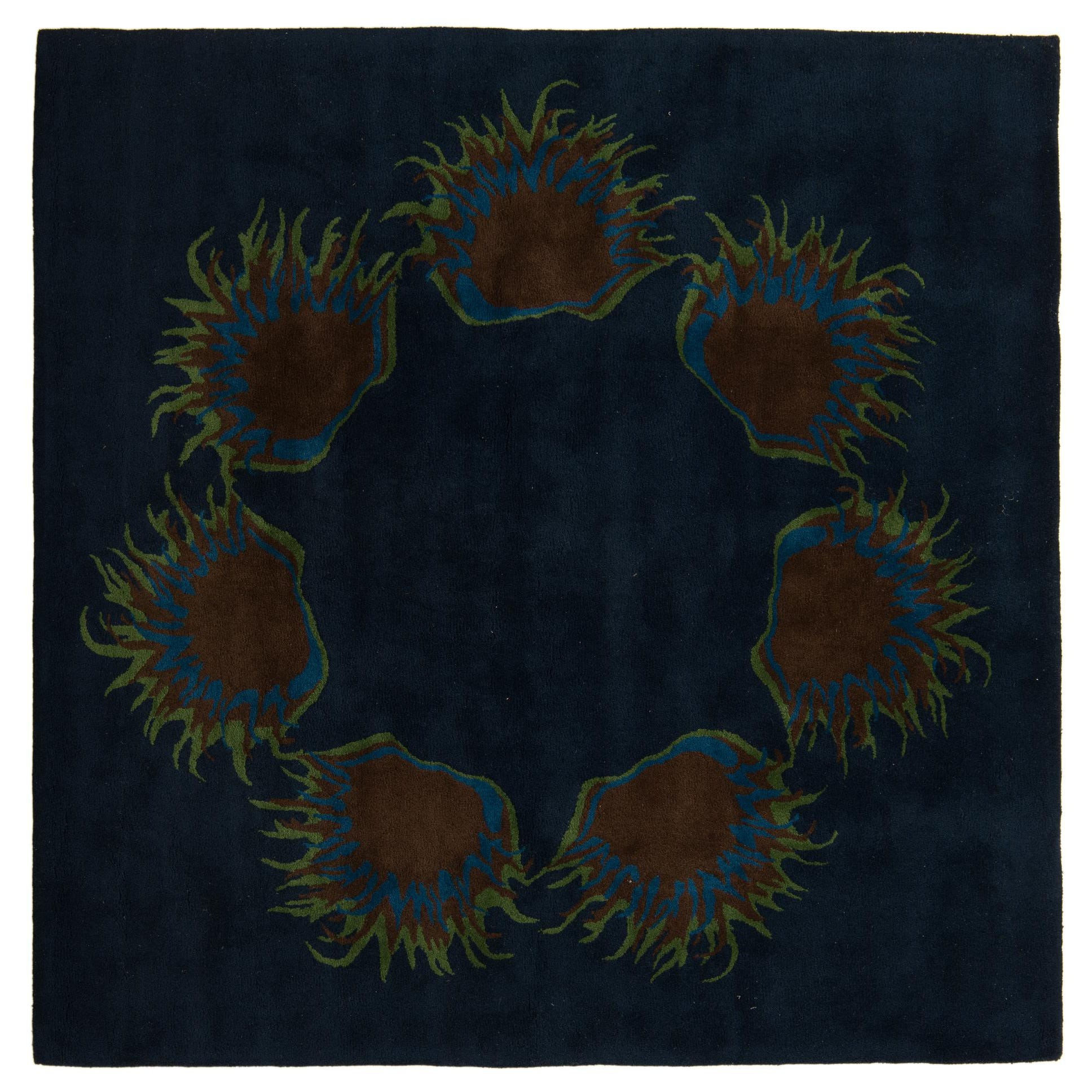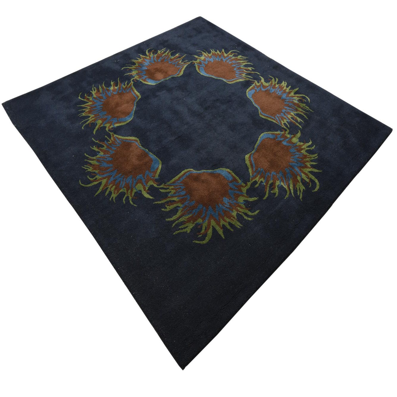 A 7' 3 x 7' 6 square navy blue modern rug with a circular pattern of abstract brown, blue, and green shapes.