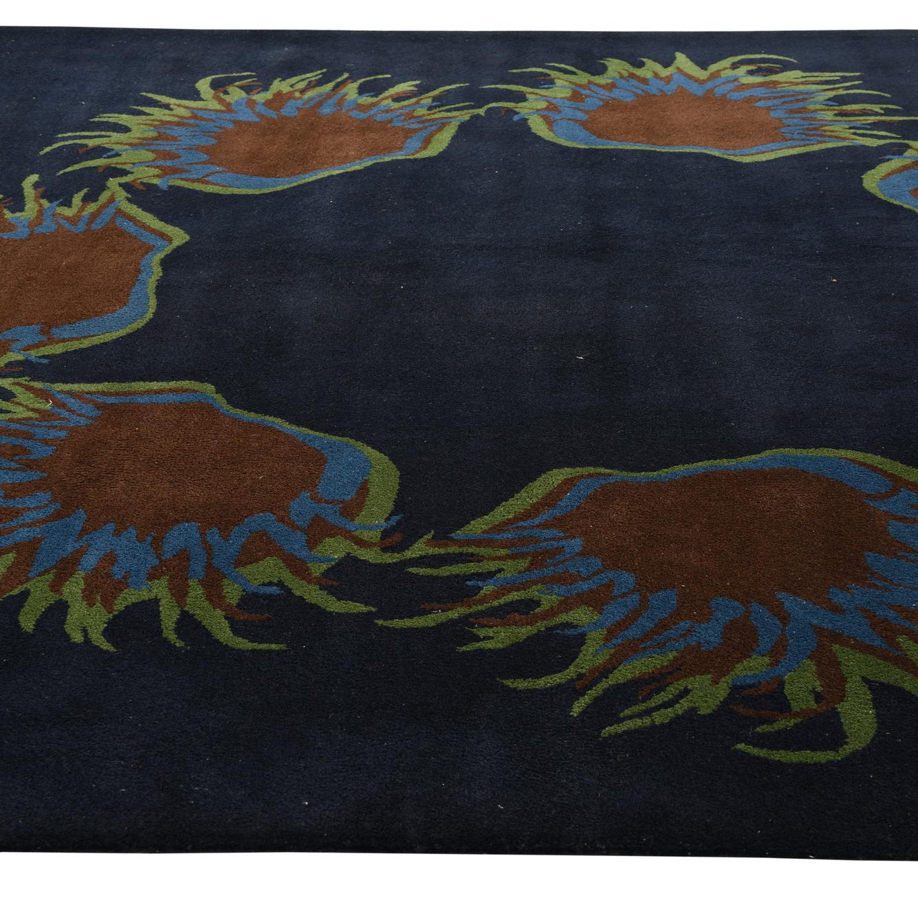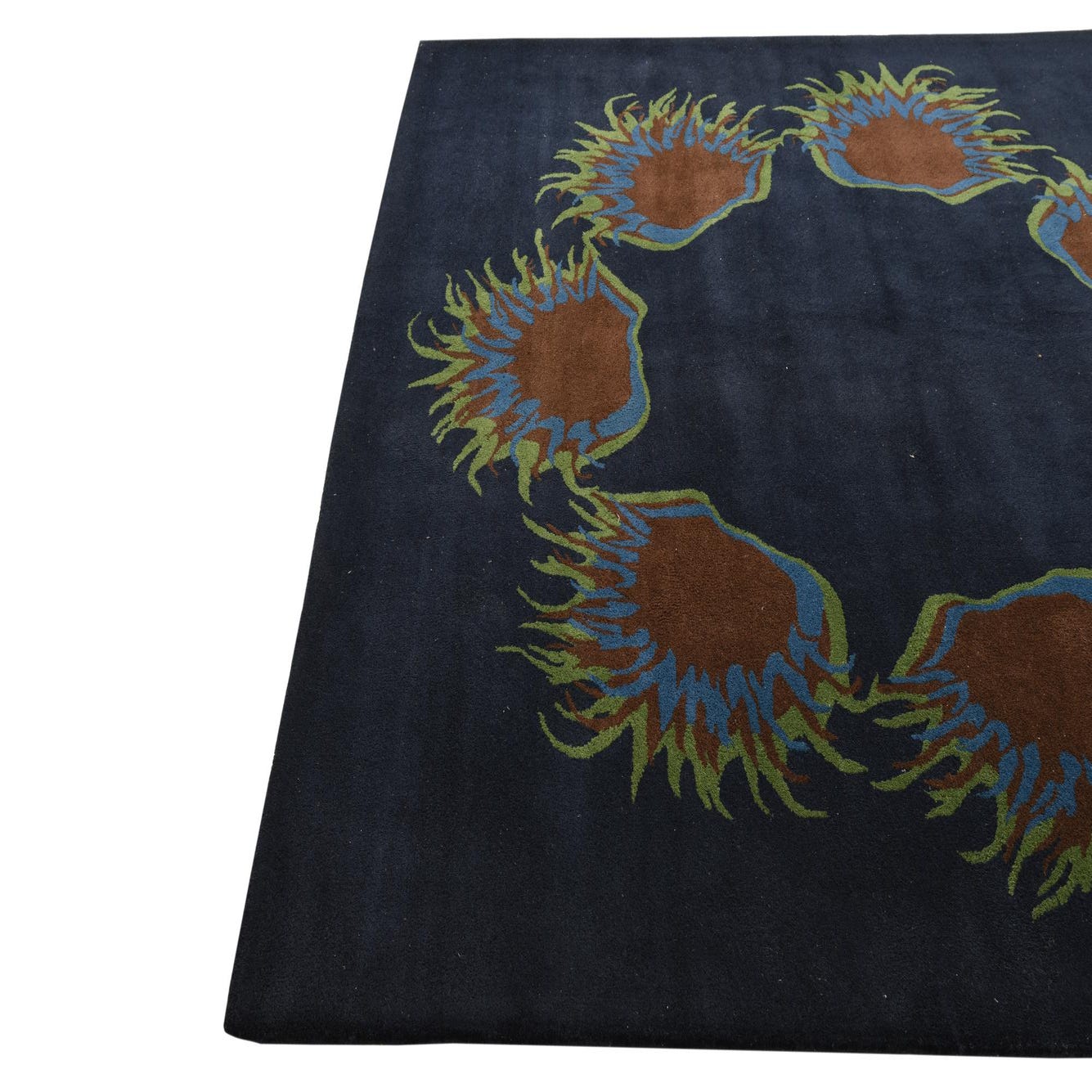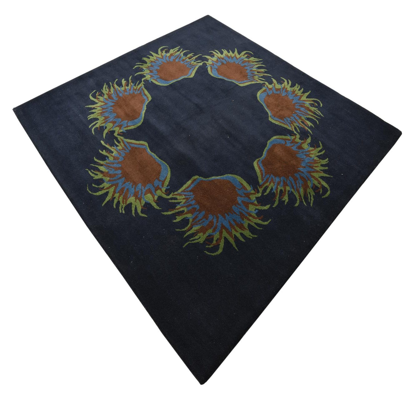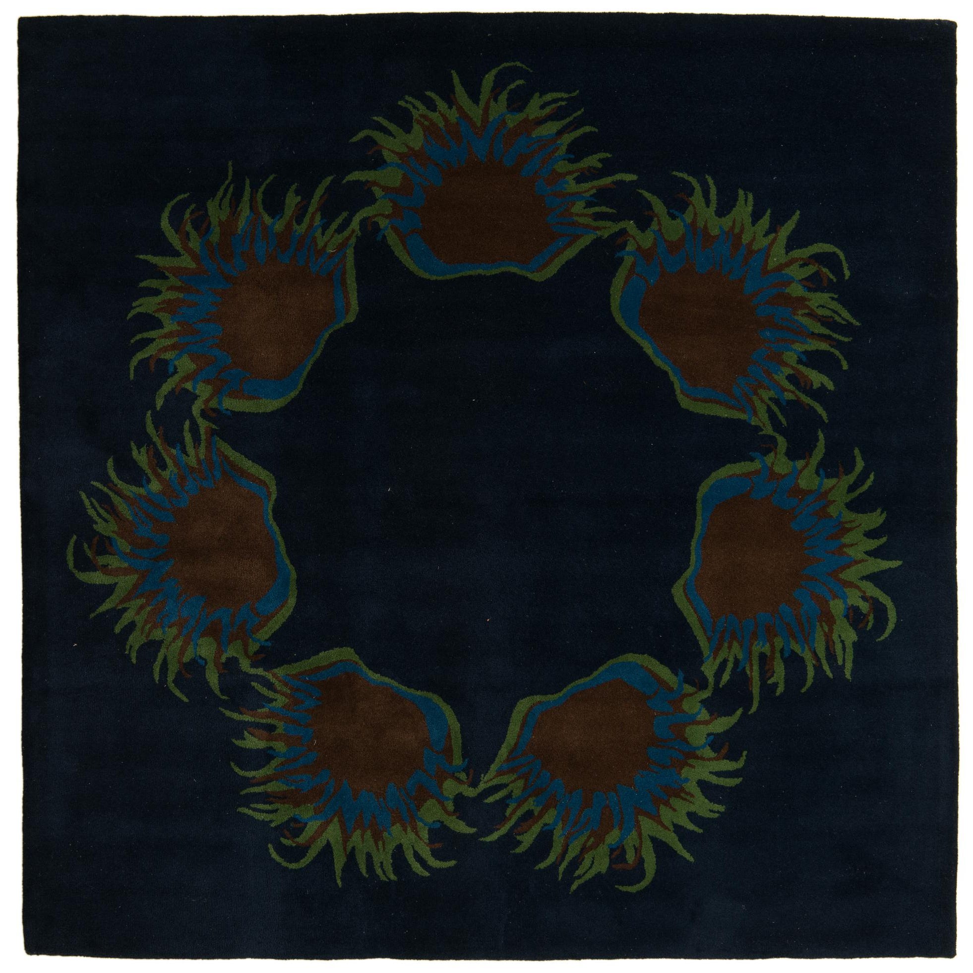 A 7' 5 x 7' 6 square navy blue modern rug with a circular pattern of abstract brown, blue, and green shapes.