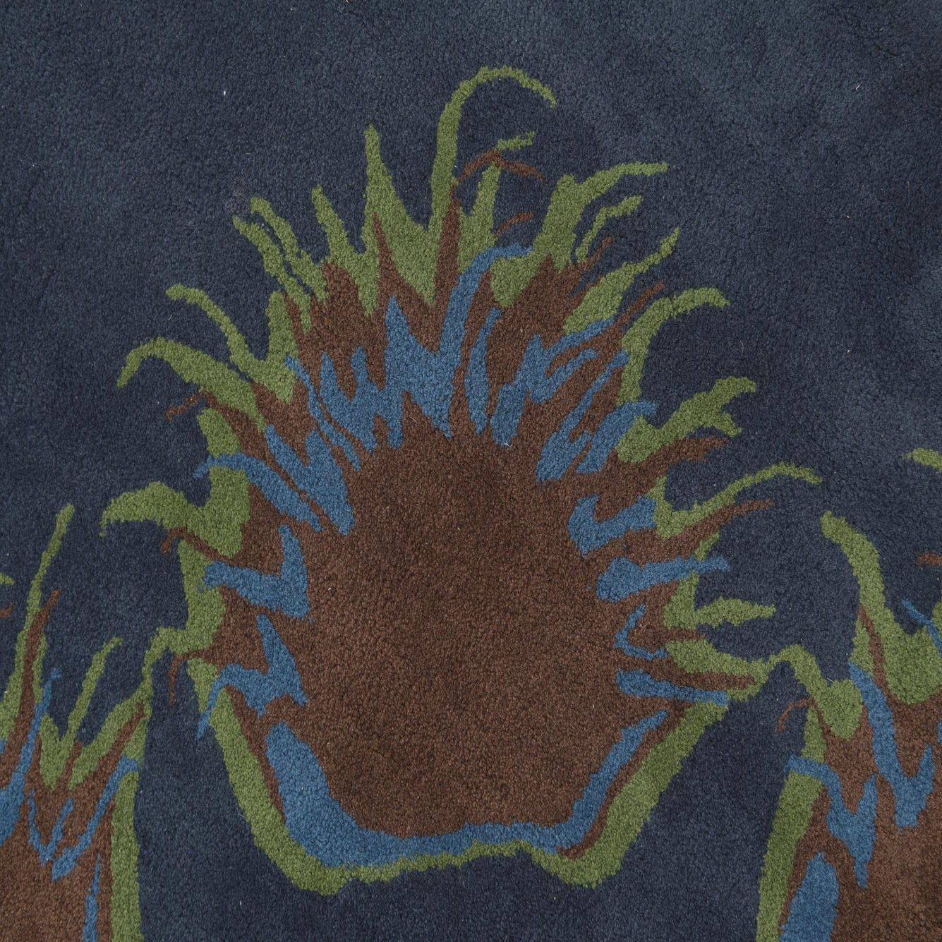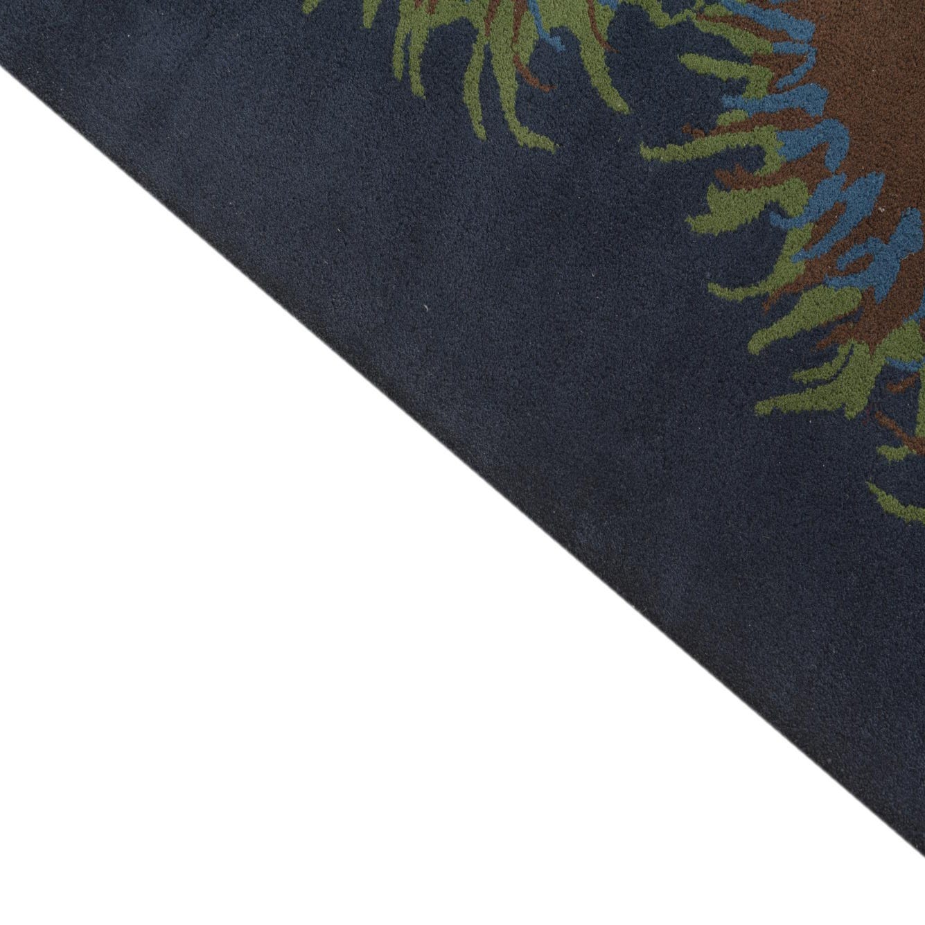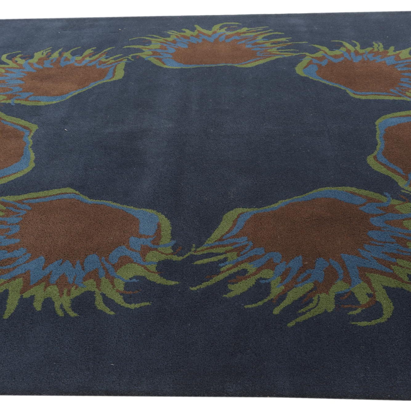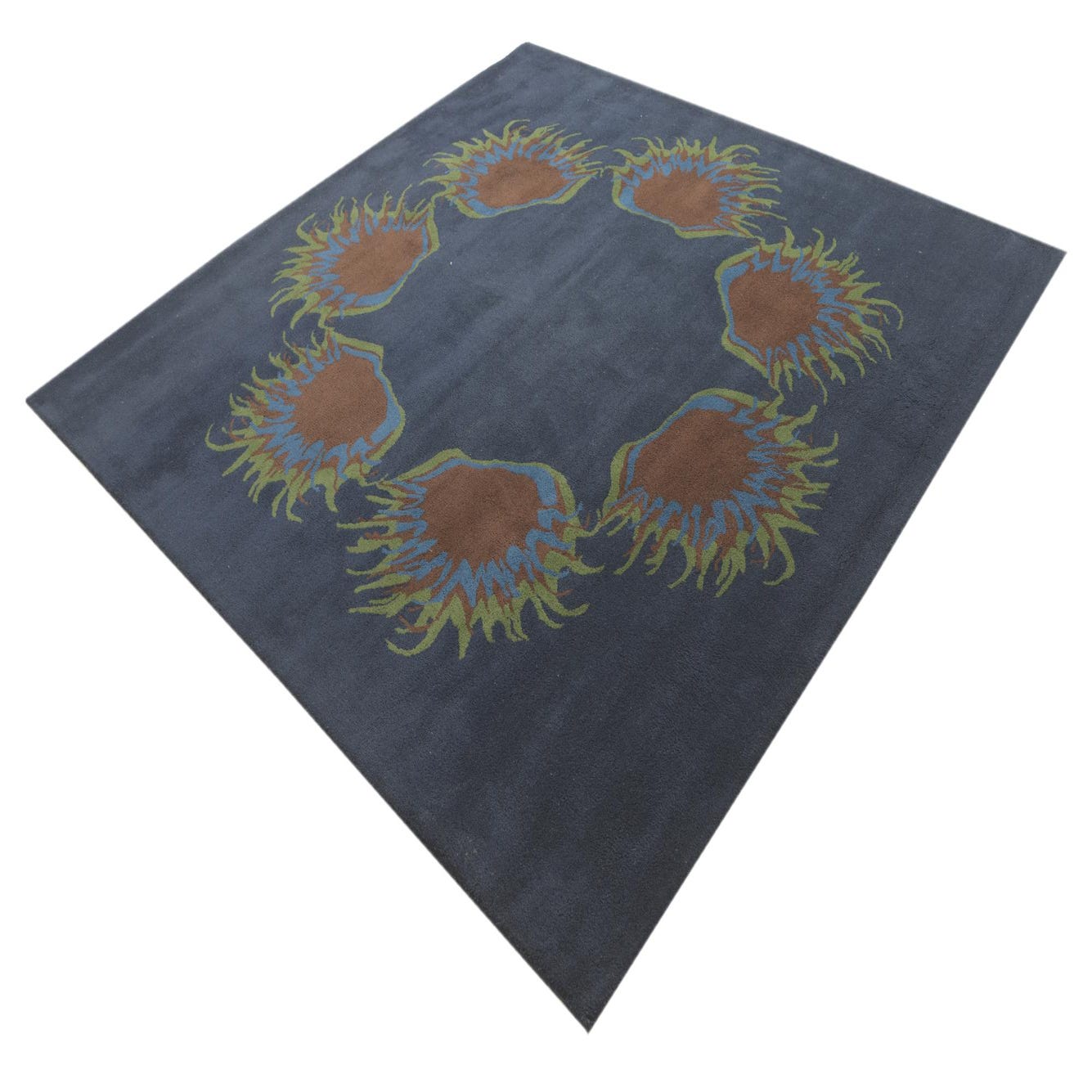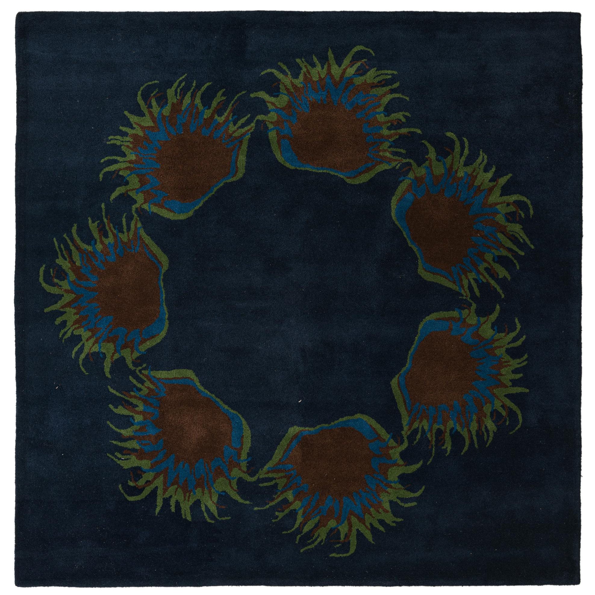 A square navy blue wool rug featuring a circular botanical pattern of brown, blue, and green floral shapes.