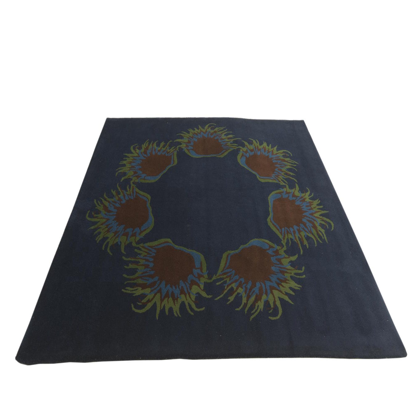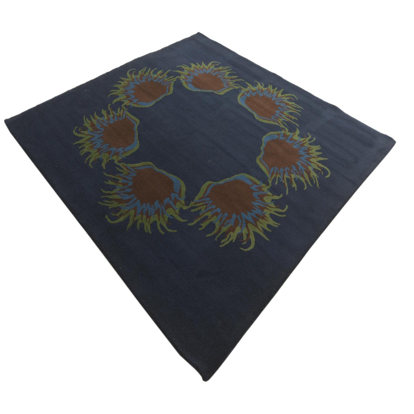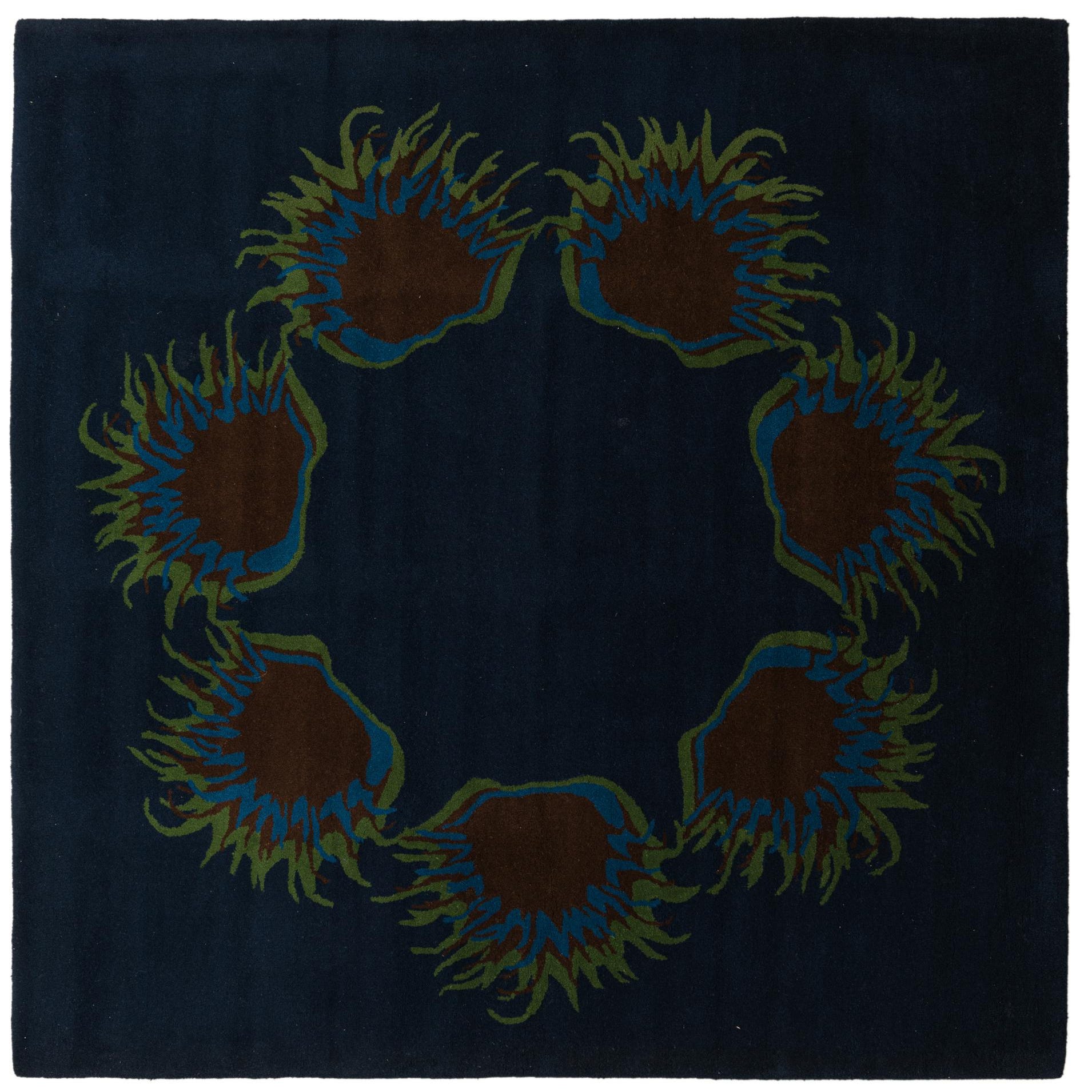 A square navy blue wool rug featuring a circular arrangement of abstract floral patterns in brown, blue, and green.
