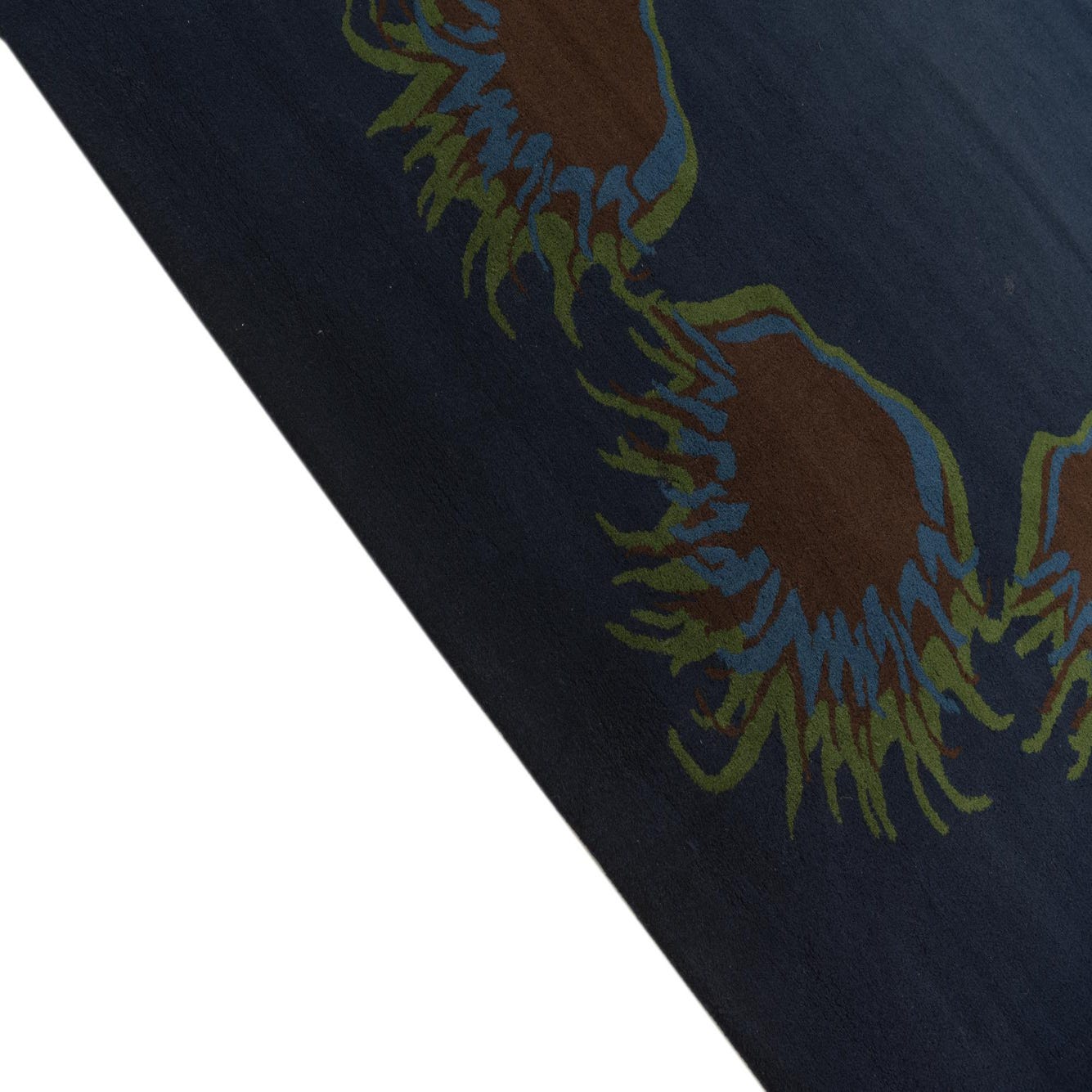 Place this rug beneath a low-profile sofa or coffee table to anchor a living room seating area, or use it in a study or den as a composed focal point. It pairs naturally with warm wood finishes, leather seating and metal accents—brass, matte black or brushed nickel—and complements both mid-century and modern furnishings. The strong navy ground and layered accent colors work well in neutral palettes for contrast or alongside richer tones for a more layered, intentional look.