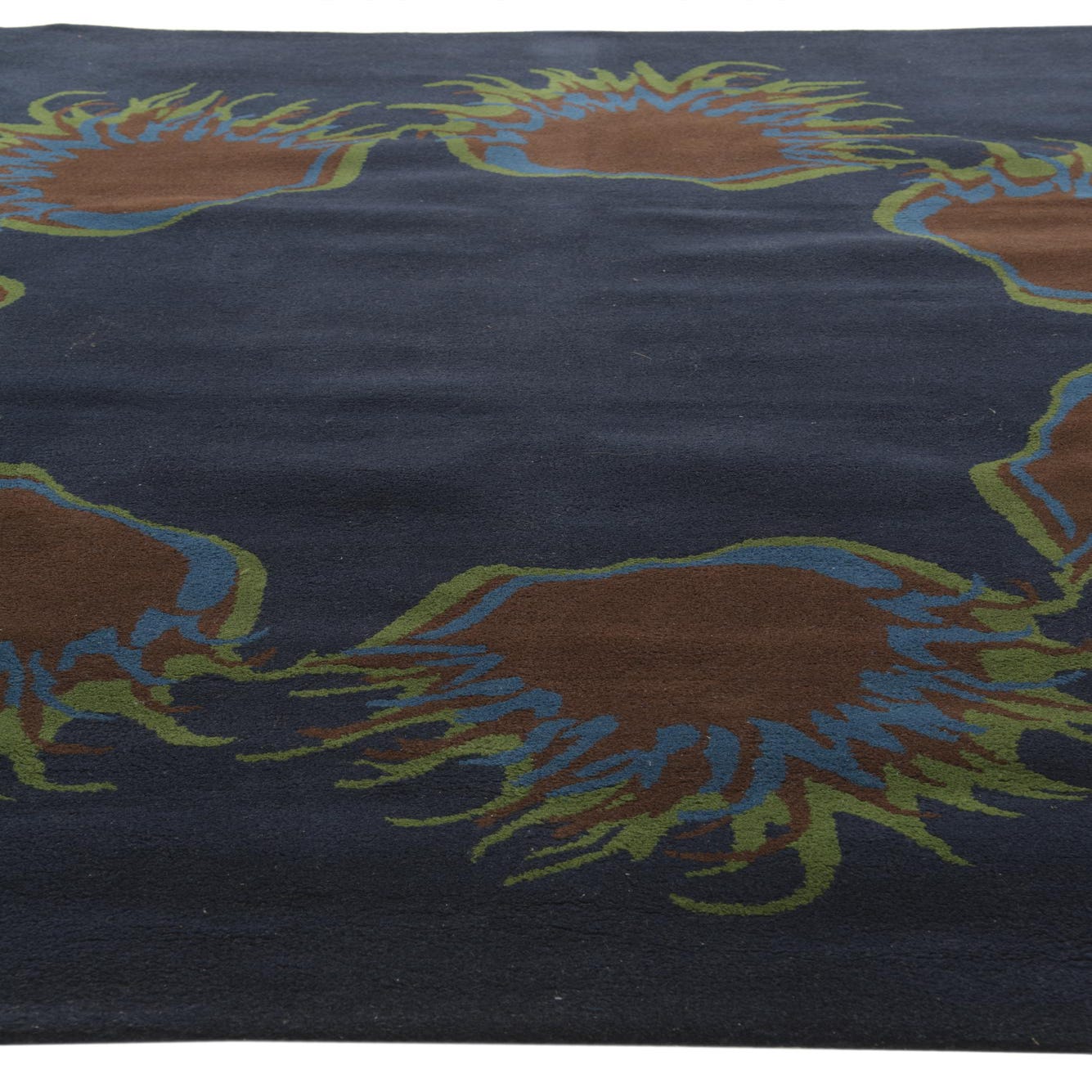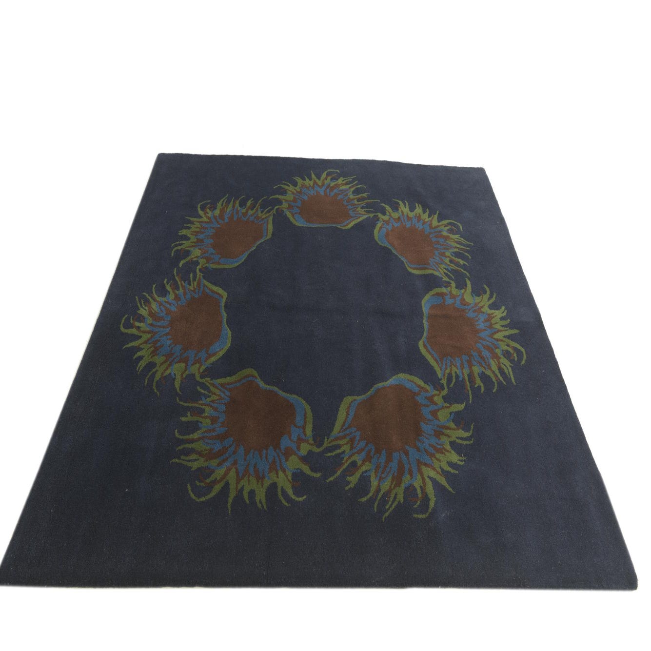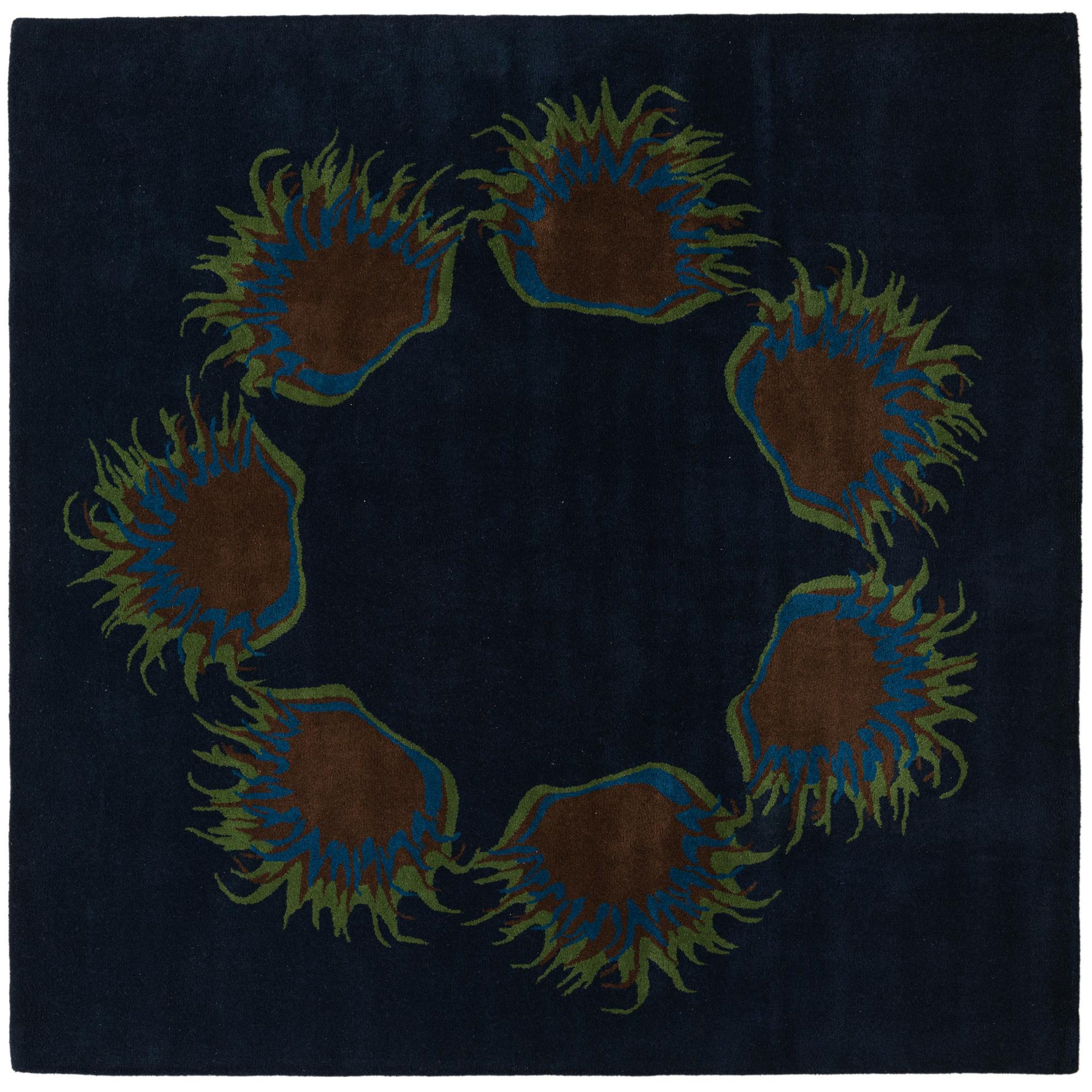 A square navy blue wool rug featuring a circular arrangement of abstract floral motifs in brown, blue, and green.