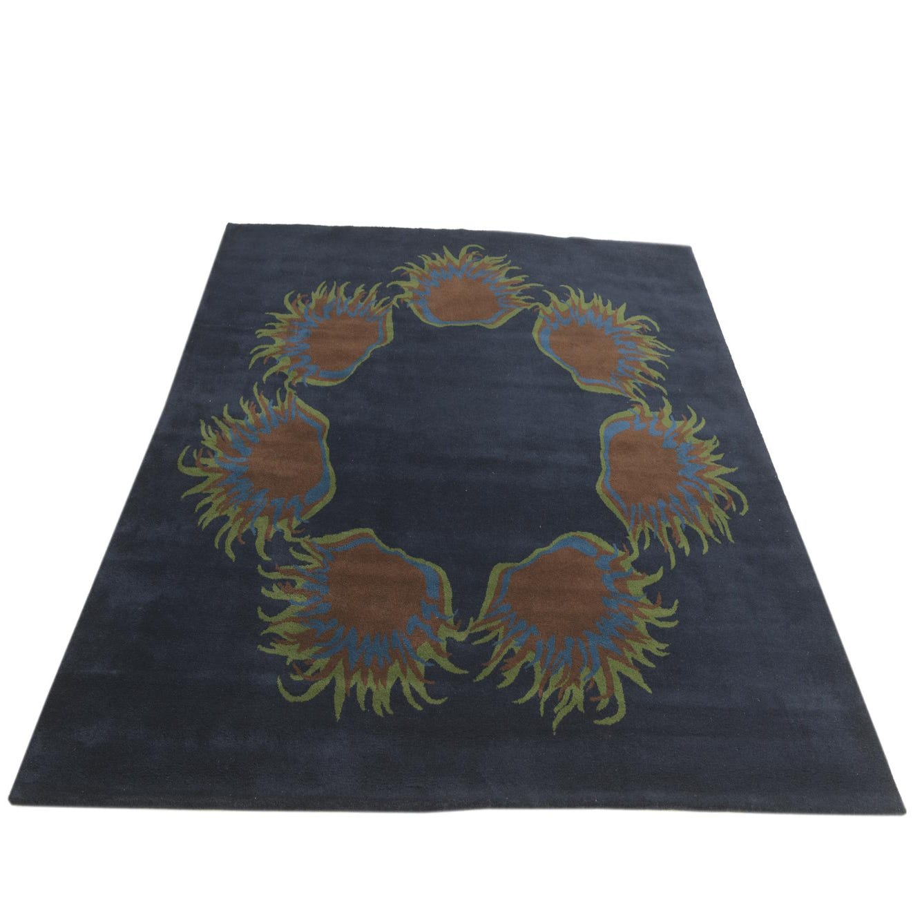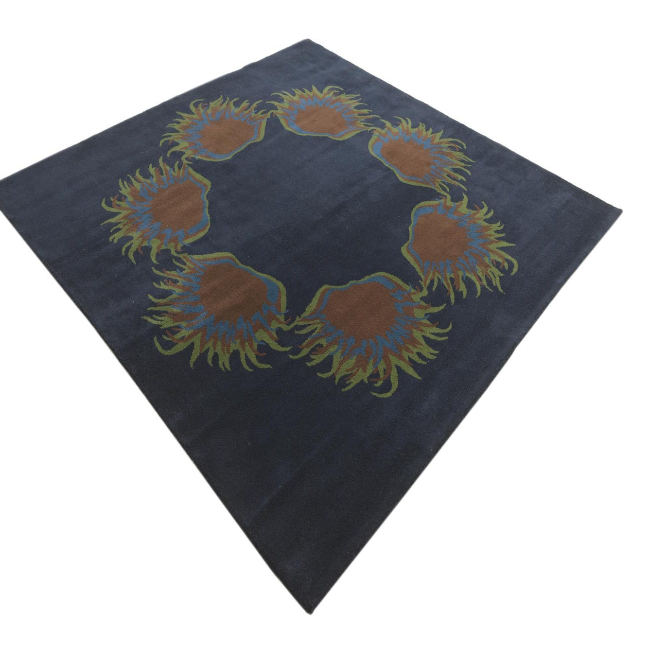 A square navy blue wool rug with a circular floral pattern of brown, blue, and green botanical shapes.
