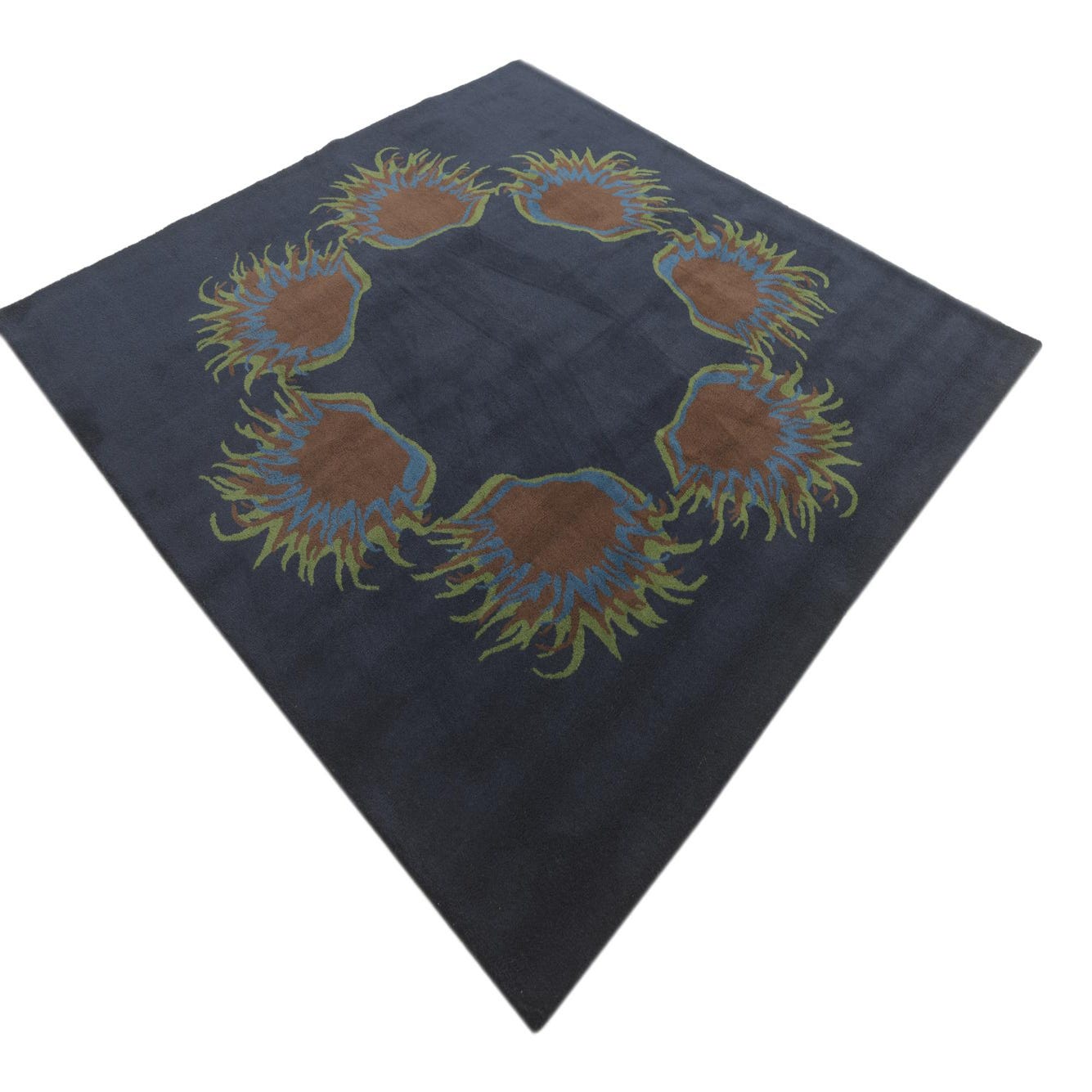 A 7' 5 x 7' 7 square navy blue wool rug featuring a circular arrangement of six brown, blue, and green floral or botanical motifs.