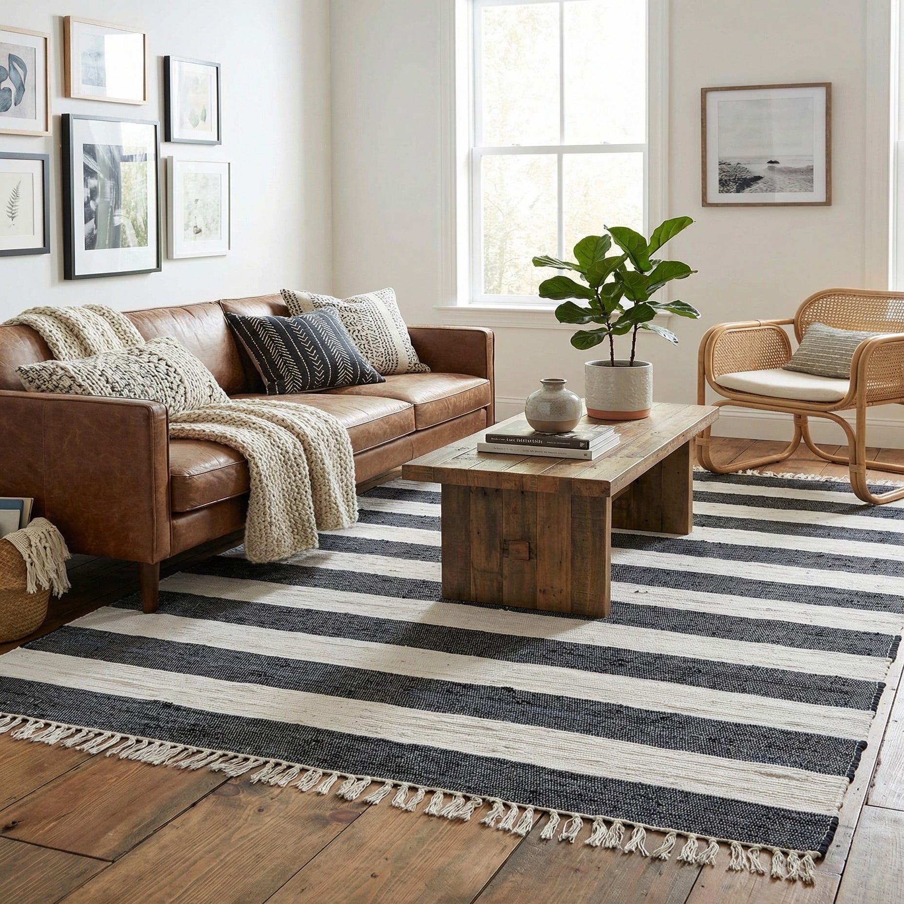 The graphic navy-and-ivory stripe reads both contemporary and casual, pairing easily with light woods, linen upholstery, or metal accents. Place it beneath a dining table for a bold yet understated foundation, use it to anchor a living room seating area with neutral sofas, or layer it in a coastal or farmhouse entry to introduce pattern without heaviness. It also complements minimalist and mid-century schemes when you want a strong, linear element that stays visually simple.