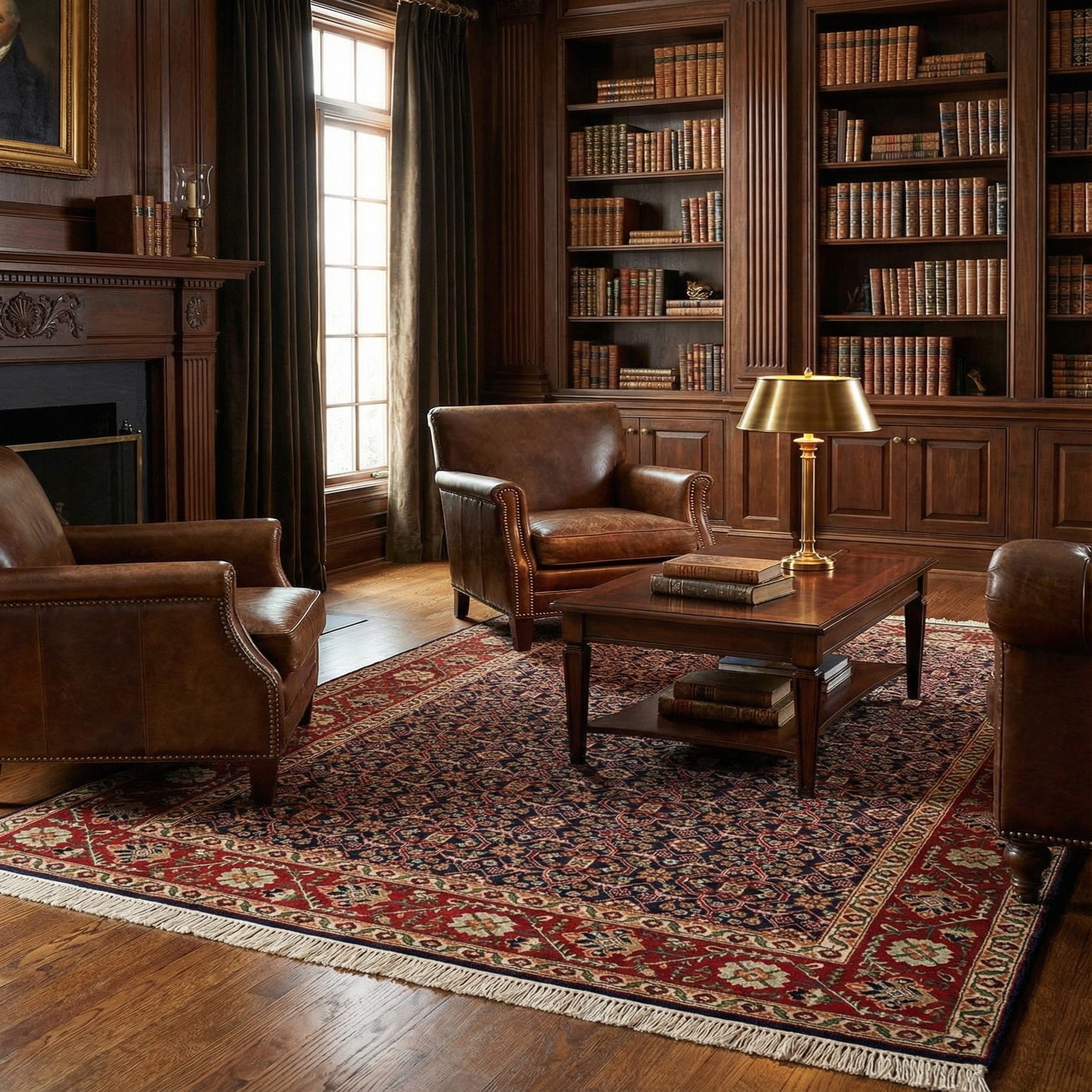 Hand-knotted of 100% wool, the pile has a low, tightly packed feel that is soft to the touch and pleasantly substantial underfoot. The natural wool texture gives a muted, matte finish that complements both painted and wood surfaces. Pair this rug with mid-century or traditional furnishings, warm wood floors and leather seating for a layered, lived-in look; it also grounds a neutral contemporary living room or adds pattern and color beneath a classic dining table. For a study or library, the navy field and detailed motif create a composed backdrop that supports strong, book-lined interiors.