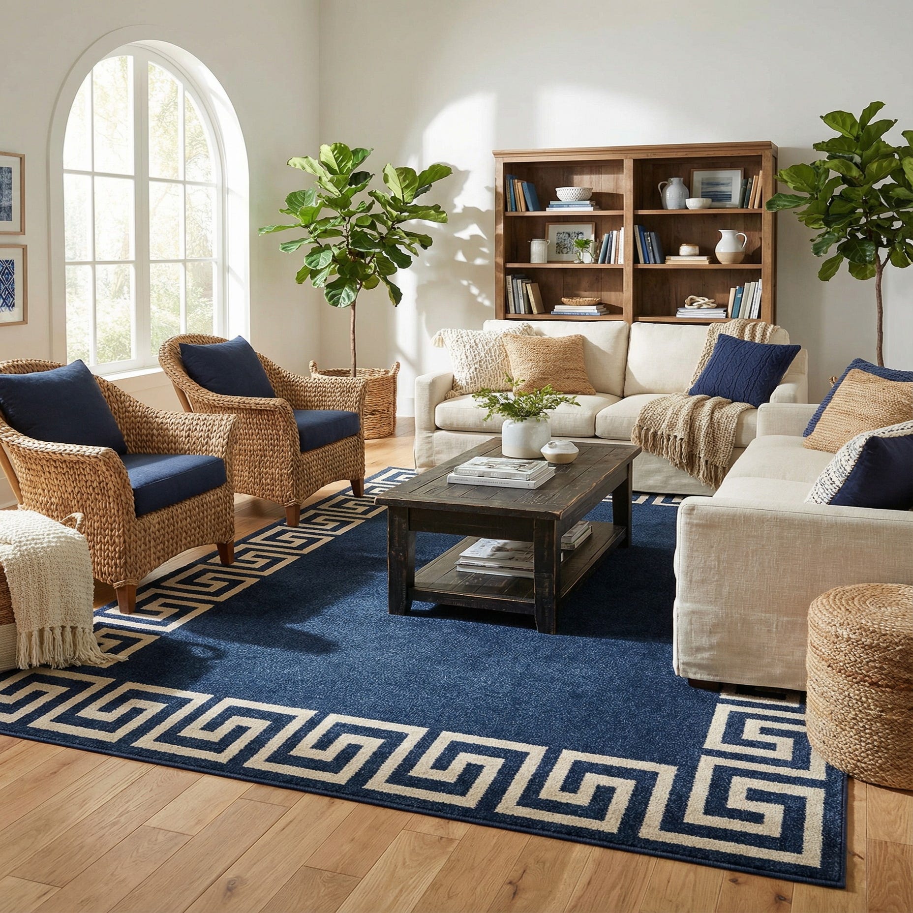 This rug works well in a variety of settings: pair it with white or natural wood furnishings for a coastal or transitional look, use it to ground a navy-and-beige living room for a pulled-together feel, or place it beneath a dining table to introduce pattern without competing with other elements. It also fits neatly in a home office or entryway where a defined border and strong color can create structure and visual focus.