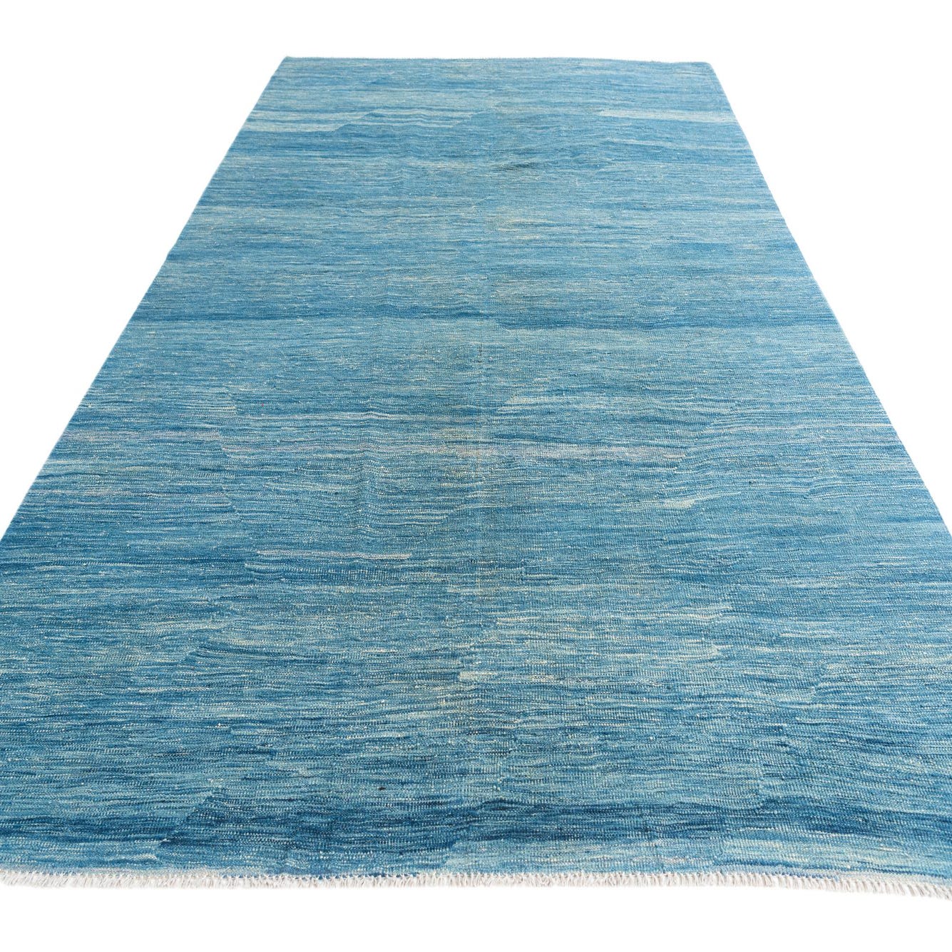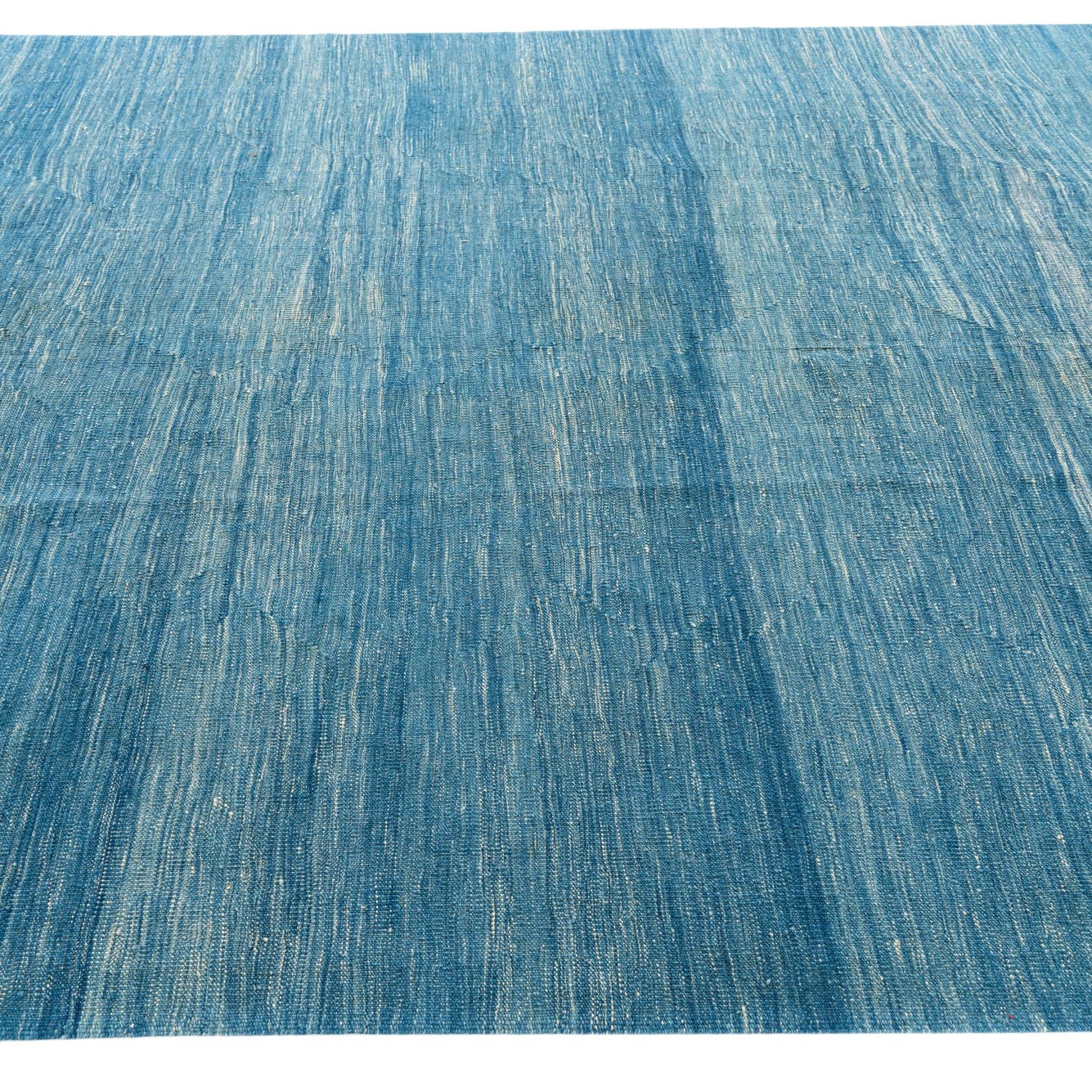 A 7x10 rectangular flatweave wool rug in varying shades of deep blue, featuring subtle horizontal striations and a Southwestern-inspired pattern.
