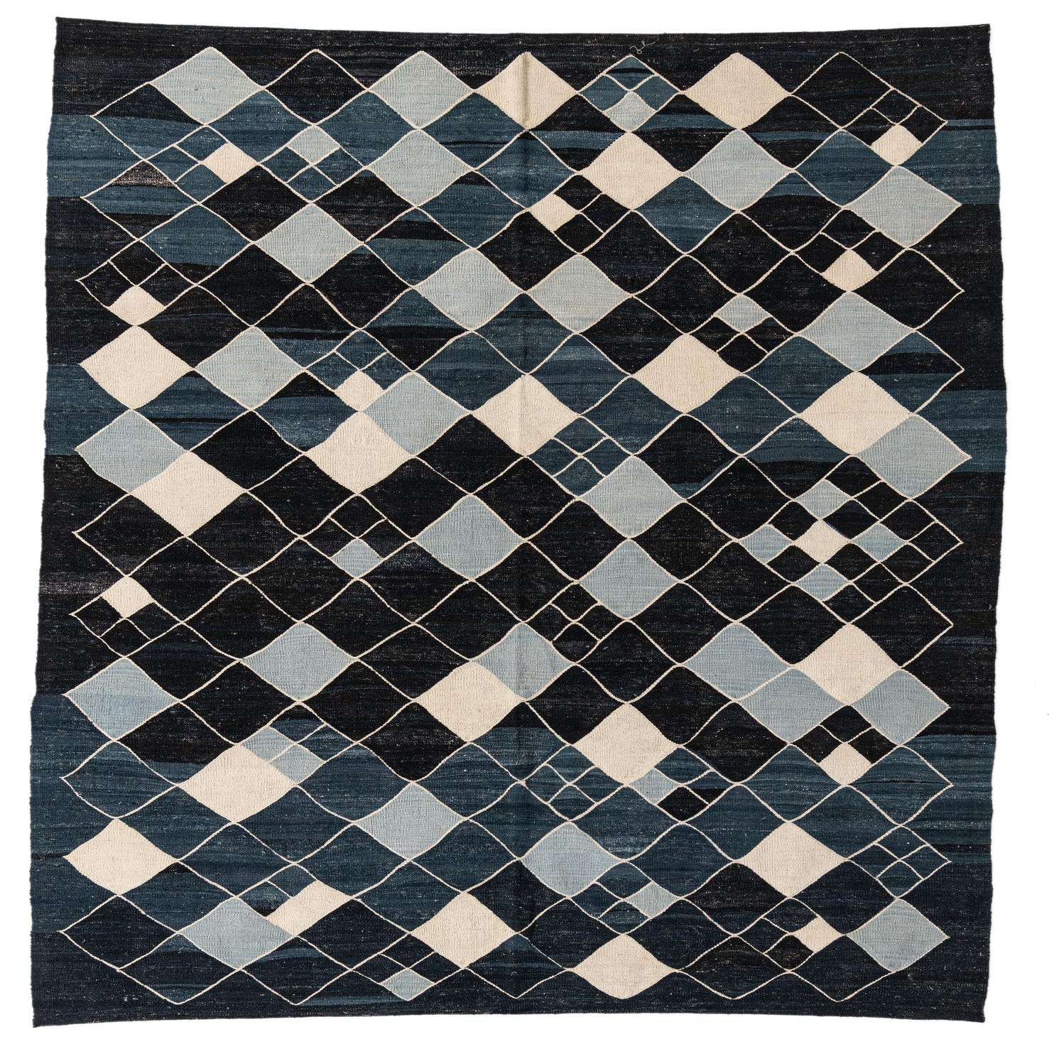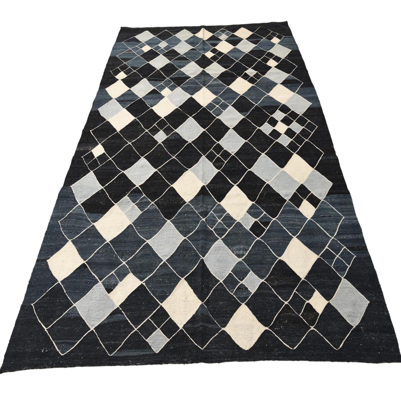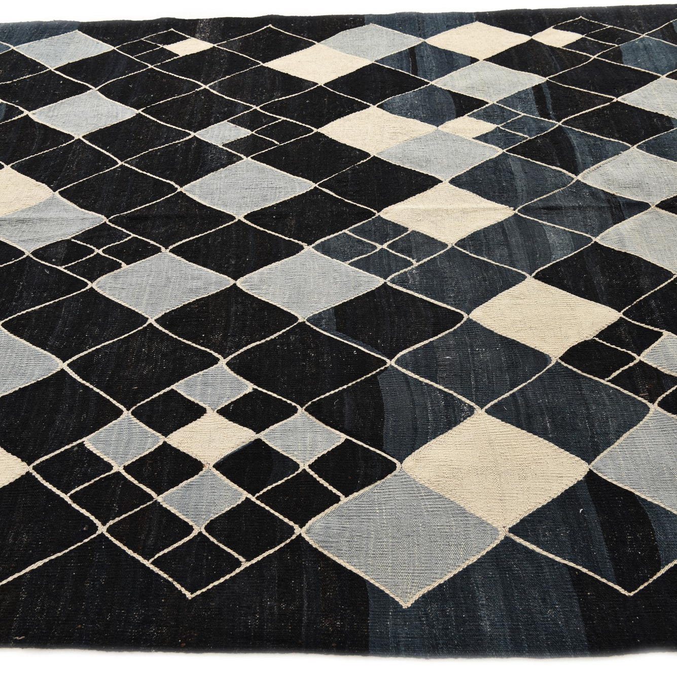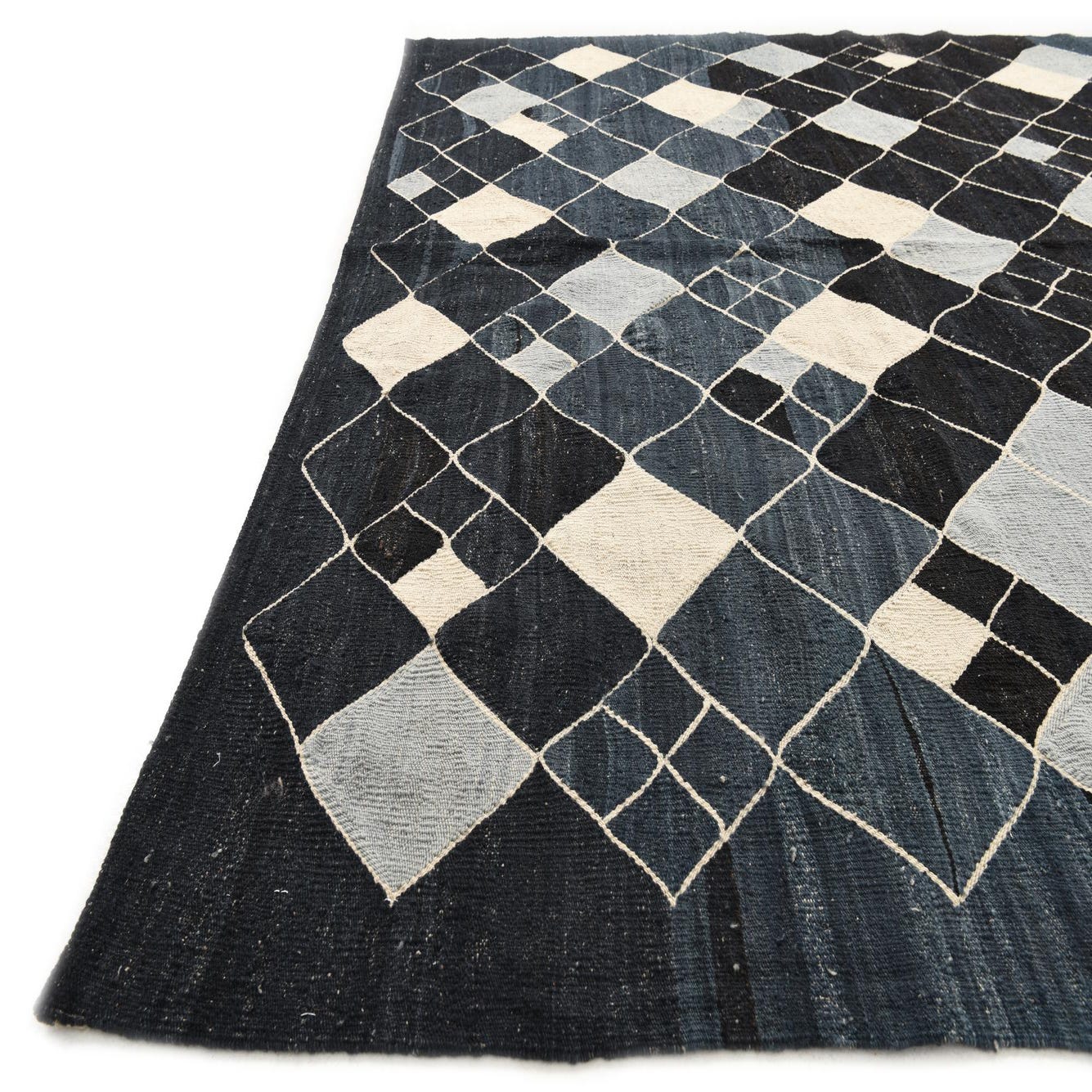 Part of our Kilim Modern collection, this hand-woven 7x10 rug is crafted from 100% wool, offering both durability and tactile pleasure. It showcases a geometric pattern with a bold interplay of navy blue, black, ivory, and light blue hues set against a predominantly navy blue background. The precise arrangement of diamond shapes creates a dynamic visual grid that adds modern flair to any space.