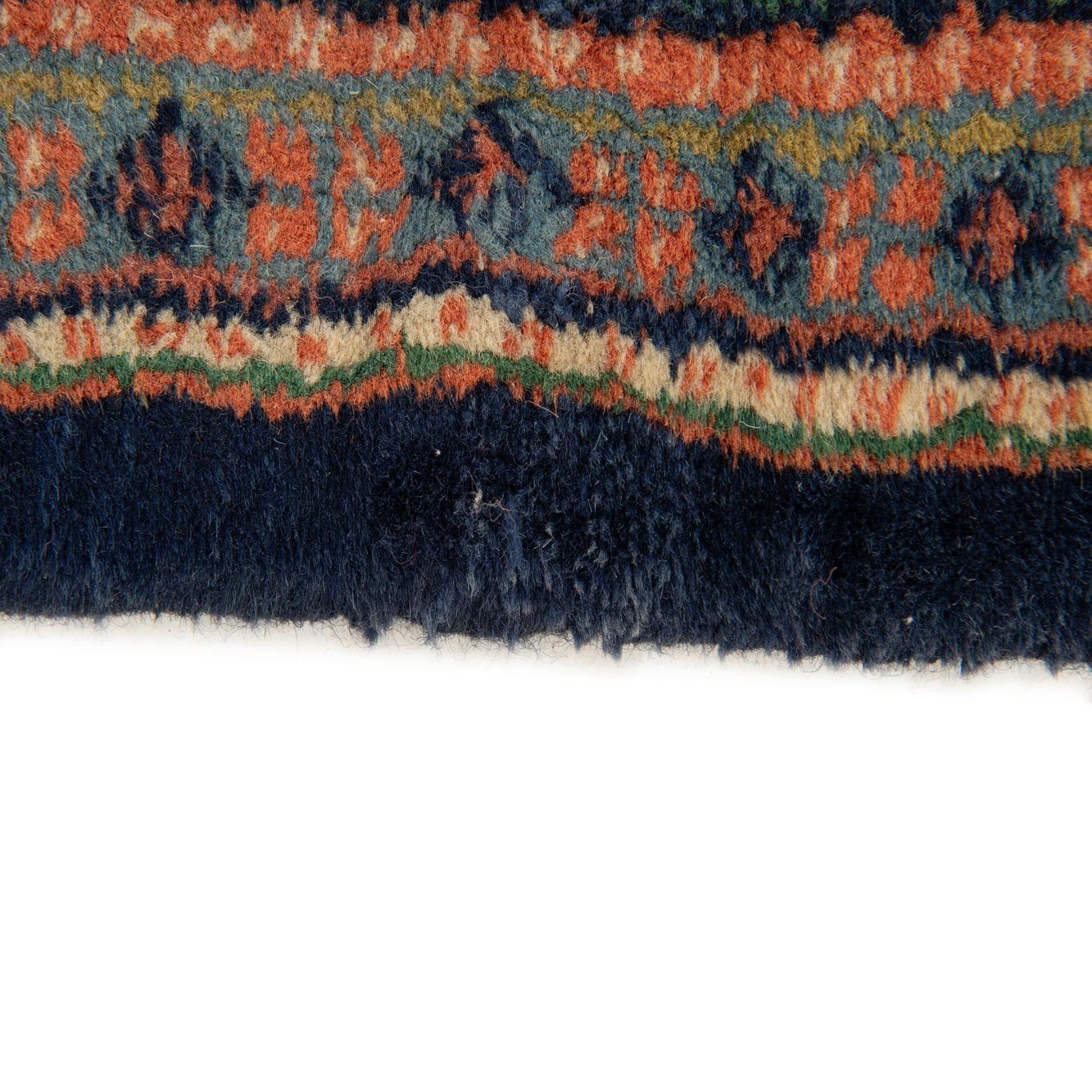 A 7x10 rectangular navy blue wool rug with an intricate oriental pattern and a detailed border.