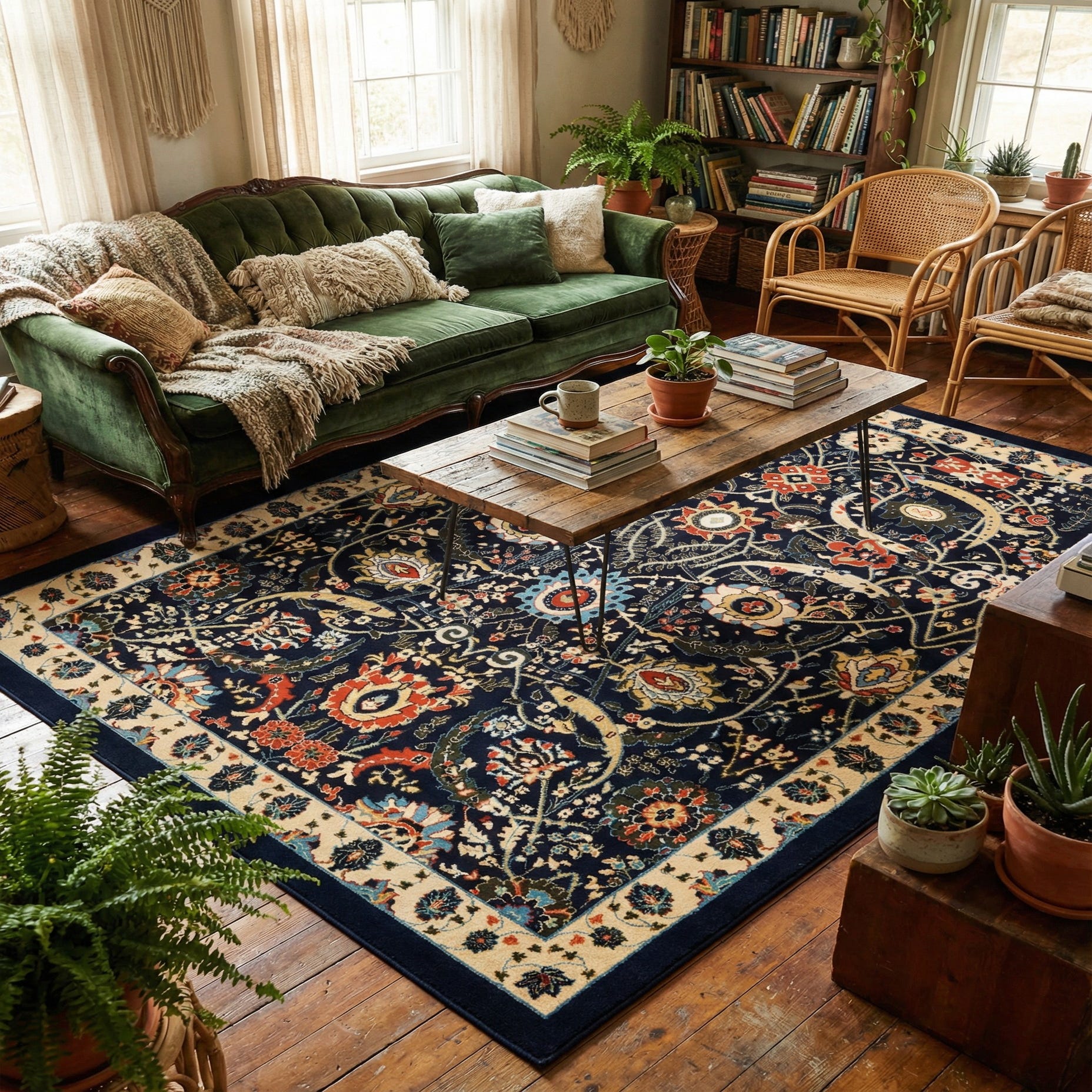 This rug works well anchoring a formal living room or sitting area where wood furniture, brass or aged-metal accents, and cream upholstery create a cohesive, traditional scheme. It also complements transitional spaces — pair it with neutral sofas, textured pillows in terracotta or olive, and warm oak tones for a lived-in yet polished feel. In a dining room or home office it defines the layout and ties together mixed finishes and color accents without overpowering the room.