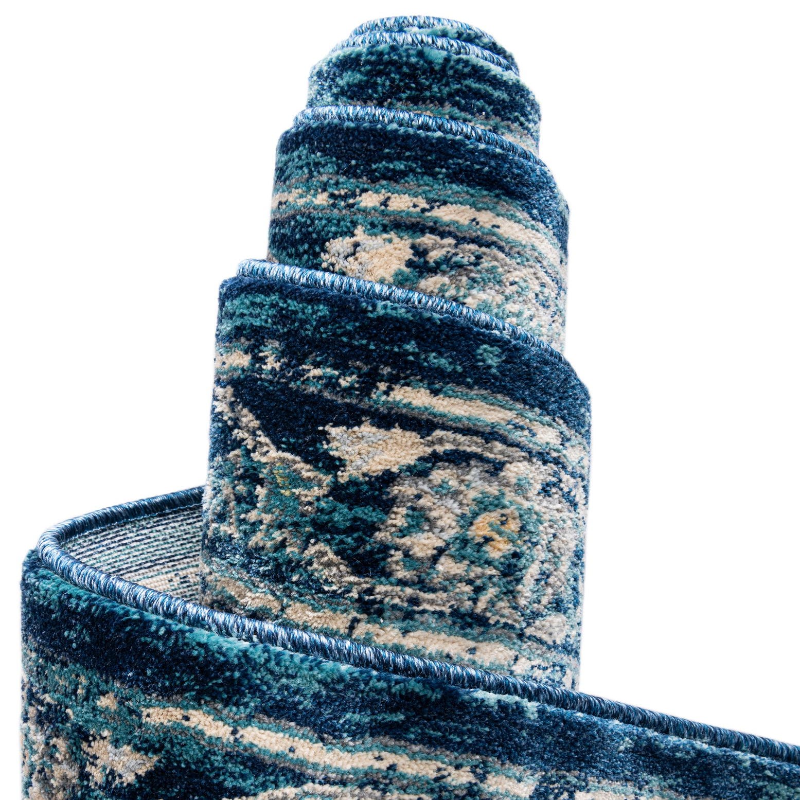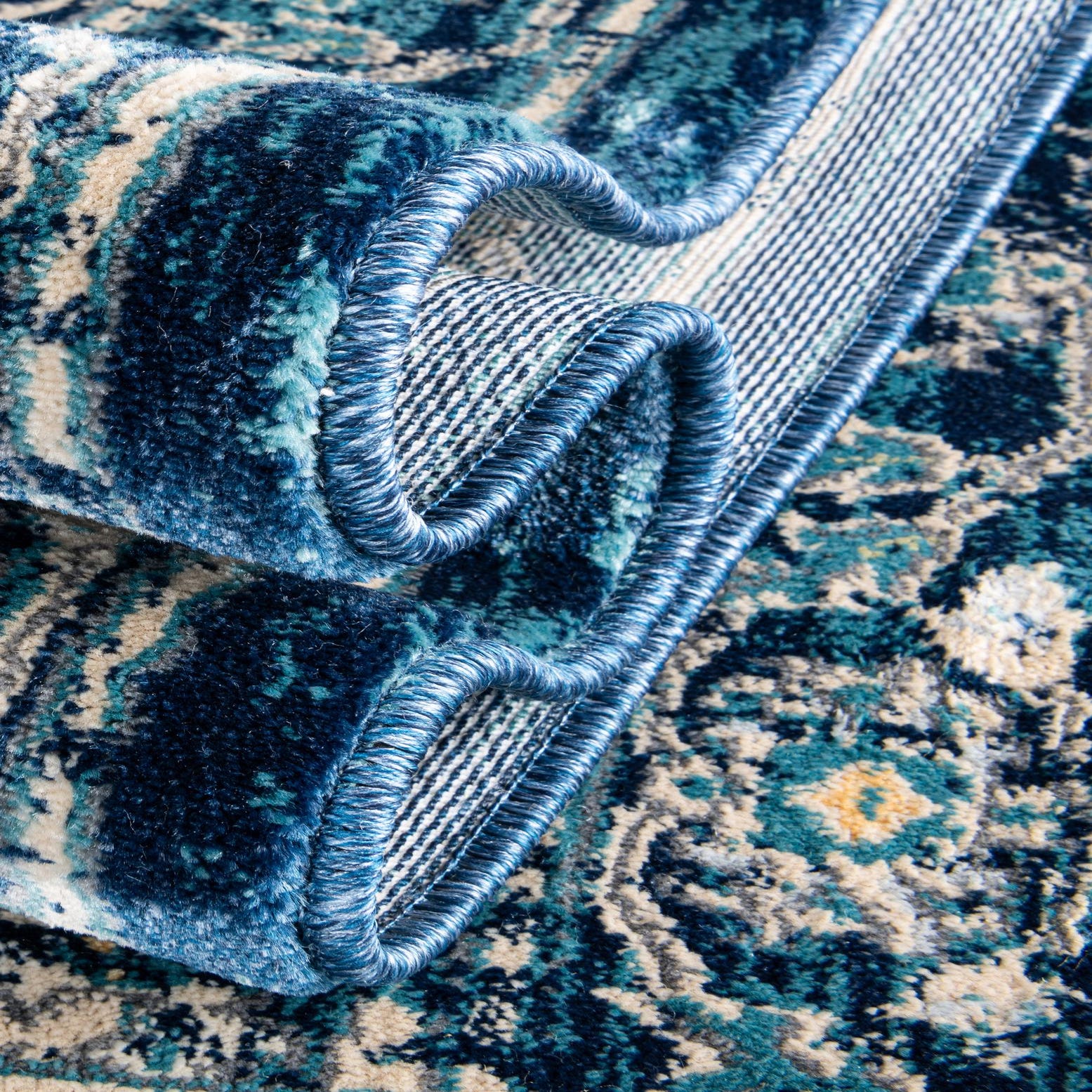 Primary color is Navy Blue. Colors in this rug include: Navy Blue, Beige, Blue, Gray, Yellow, Cream.