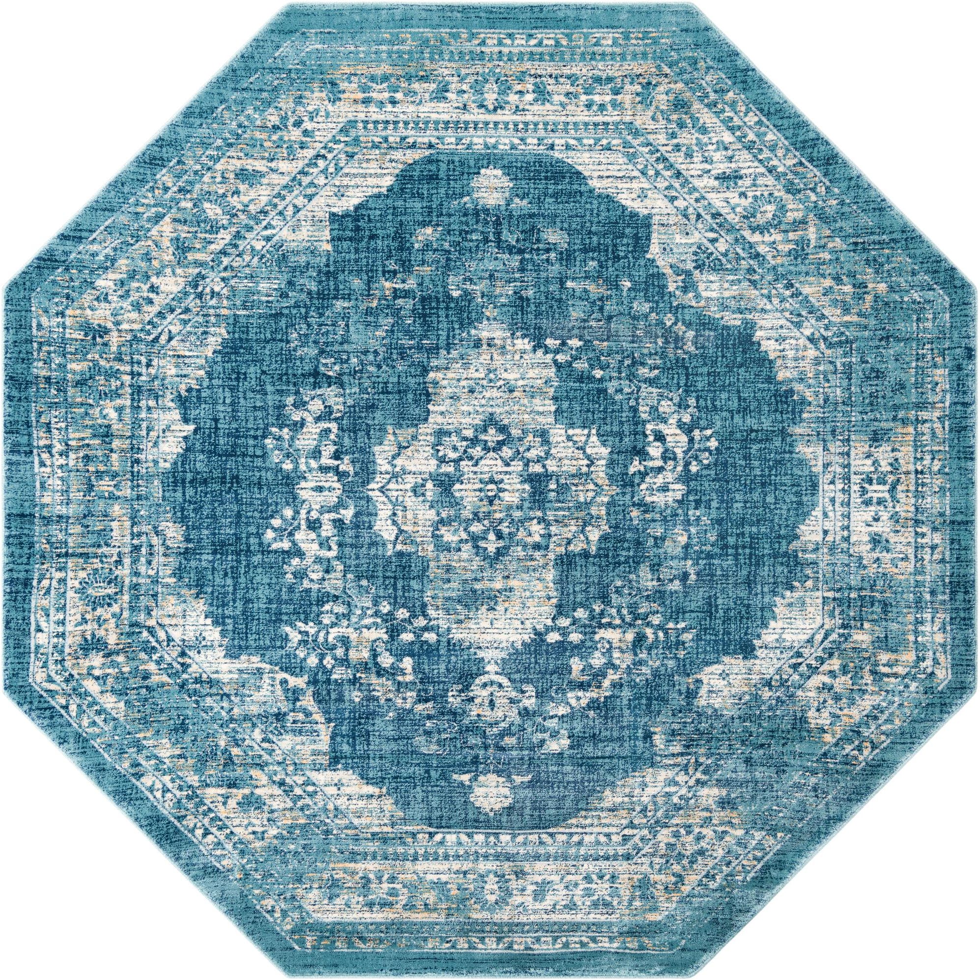 A centered medallion and ornate border give this octagonal rug a classic, slightly aged Persian look updated with contemporary color. The navy blue background anchors the design while layered tones of blue and gray create depth; touches of beige, tan and yellow highlight the floral motifs and worn detailing. The overall effect is a balanced, vintage-inspired pattern that brings structure without feeling formal.