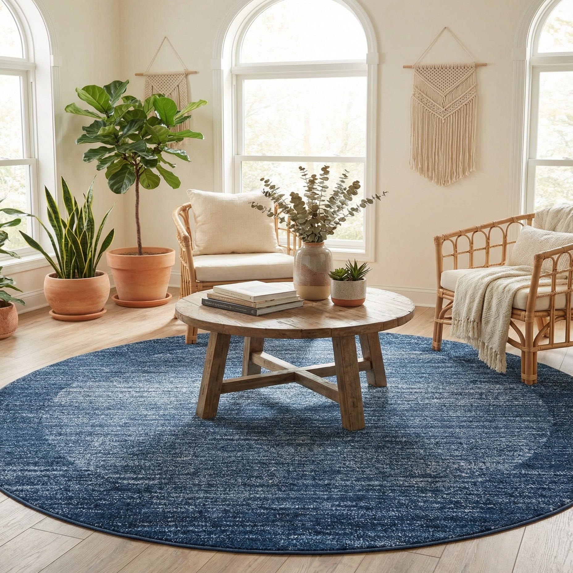 This rug works well to anchor a round dining table or to center a seating area in a living room, where its deep blues provide an elegant backdrop for light upholstery or warm wood furniture. It also pairs nicely with coastal and nautical schemes, contemporary and transitional interiors, or a home office that needs a calming, grounded base. Layer it over a natural-fiber rug for added texture or place beneath simple, clean-lined furniture to let the color and subtle pattern take the lead.