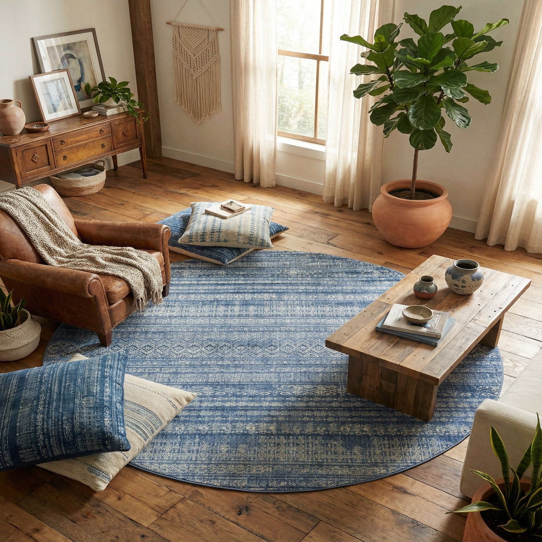 This round rug fits well in casual-luxe settings — layer it beneath a round dining table in a bright breakfast nook, center it under a compact seating group in a living room, or place it in a bedroom seating area to anchor furniture. Its navy base pairs naturally with soft woods, white or ivory upholstery, and coastal or transitional palettes, while the blue and ivory pattern adds visual texture to modern farmhouse, coastal, or relaxed contemporary interiors.