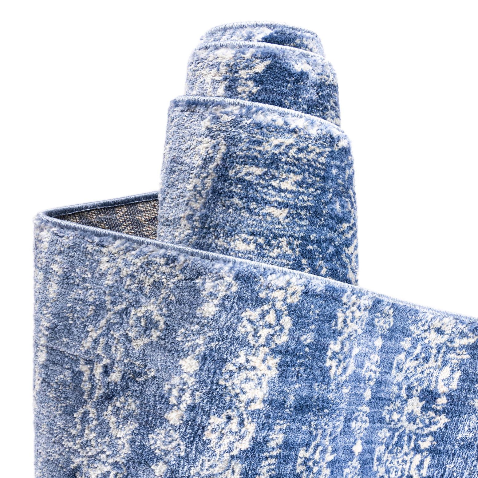 This round rug fits well in casual-luxe settings — layer it beneath a round dining table in a bright breakfast nook, center it under a compact seating group in a living room, or place it in a bedroom seating area to anchor furniture. Its navy base pairs naturally with soft woods, white or ivory upholstery, and coastal or transitional palettes, while the blue and ivory pattern adds visual texture to modern farmhouse, coastal, or relaxed contemporary interiors.