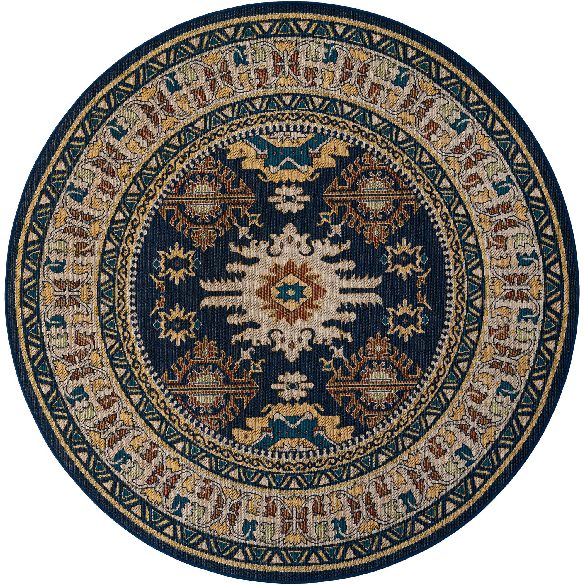 A round navy blue Baja Outdoor rug with a traditional medallion pattern in gold, beige, and teal, suitable for a patio.