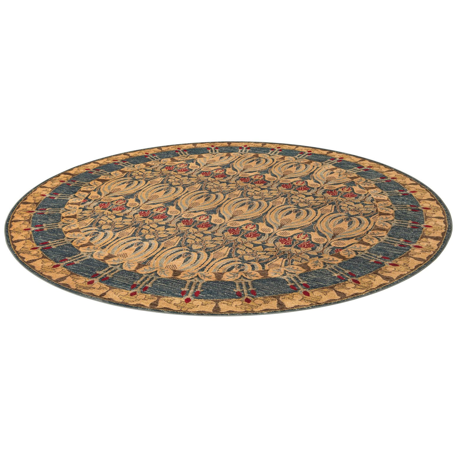 A classic floral medallion rendered on a navy blue ground gives this round rug a timeless feel. Repeating tulip-like motifs and leafy arabesques are woven in warm tan and olive tones, with small red accents that punctuate the pattern and add visual interest. A narrow brown and tan garland border frames the design, while variations of blue provide subtle depth across the field. The overall effect is traditional with a relaxed, slightly vintage character.
