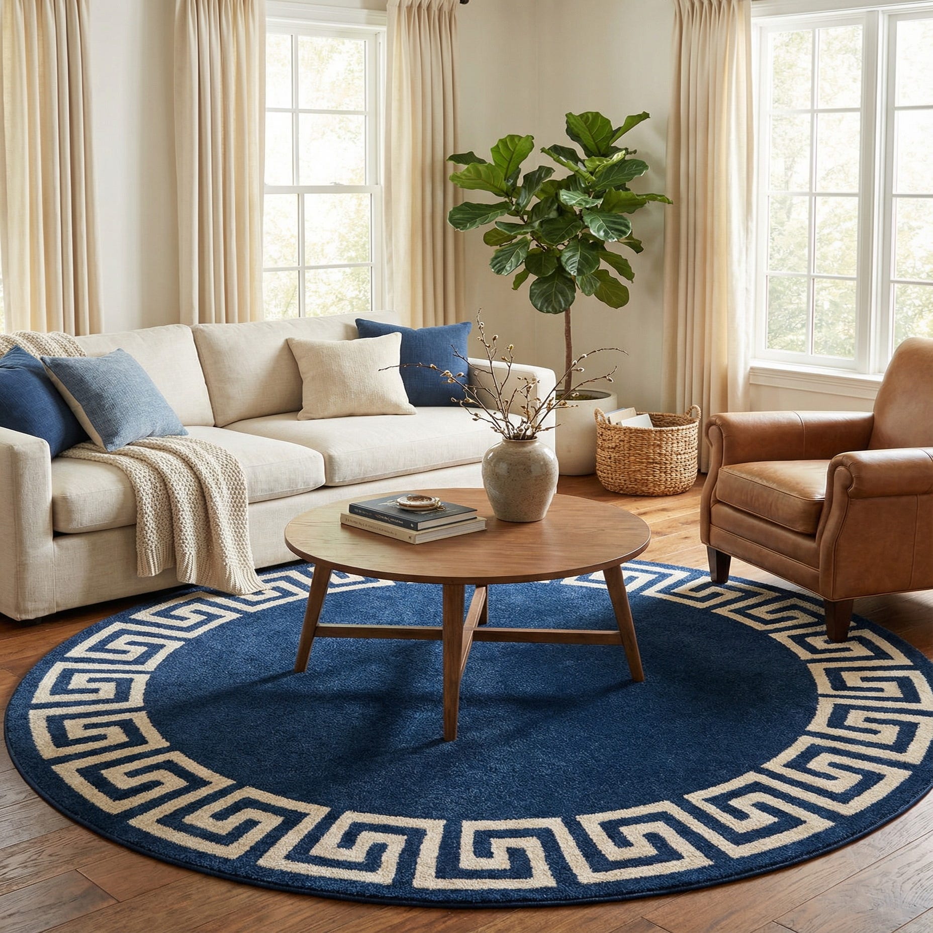 Machine-made from 100% polypropylene, this round rug has a dense, low-profile pile that feels smooth and slightly plush underfoot. A navy blue background anchors the design, while a continuous beige Greek key border provides a crisp, geometric frame. The contrast between the deep navy field and the lighter border gives the rug a clean, tailored look, and the polypropylene weave carries a subtle sheen that catches light across the surface.