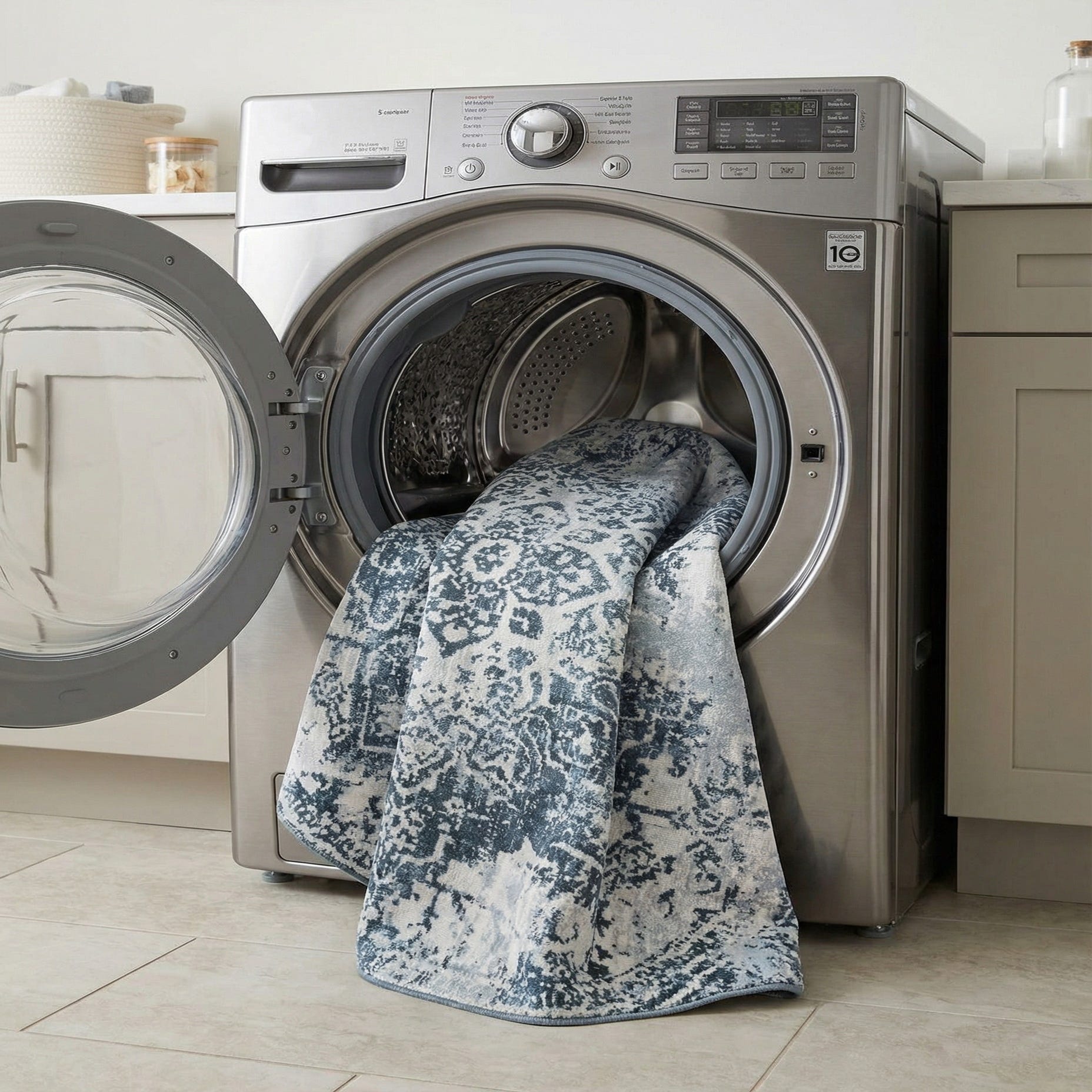 A round 7' 10 x 7' 10 Kamala Washable rug featuring a distressed blue medallion and traditional pattern on a light background.