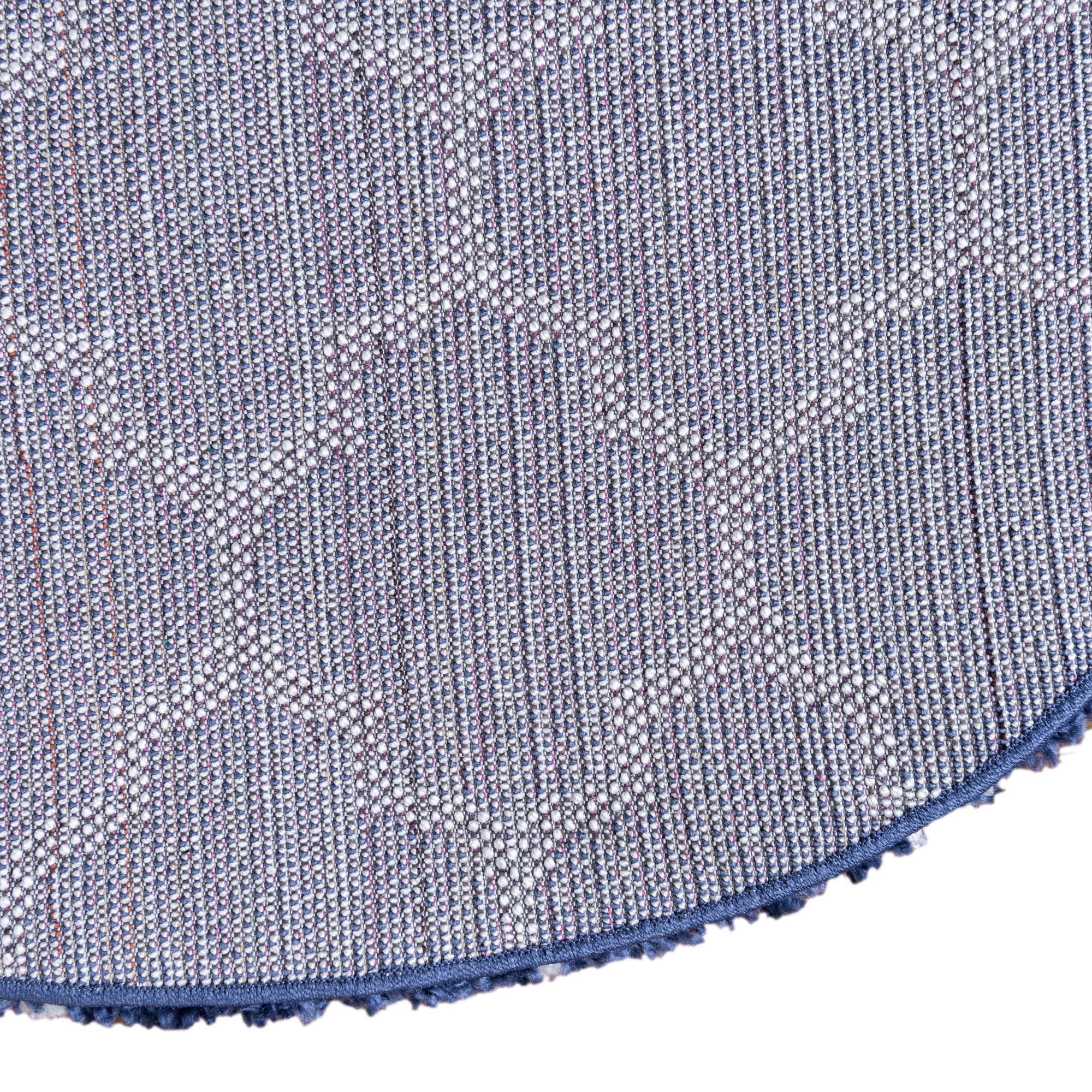 A deep navy blue ground sets a rich backdrop for a repeating ivory Moroccan-inspired trellis. The pattern provides clear geometric rhythm while the thick shag pile invites bare feet — plush, dense fibers create a cushioned, tactile surface that reads as both cozy and visually structured. Machine-made from 100% polypropylene, the construction delivers consistent texture and an easygoing look.