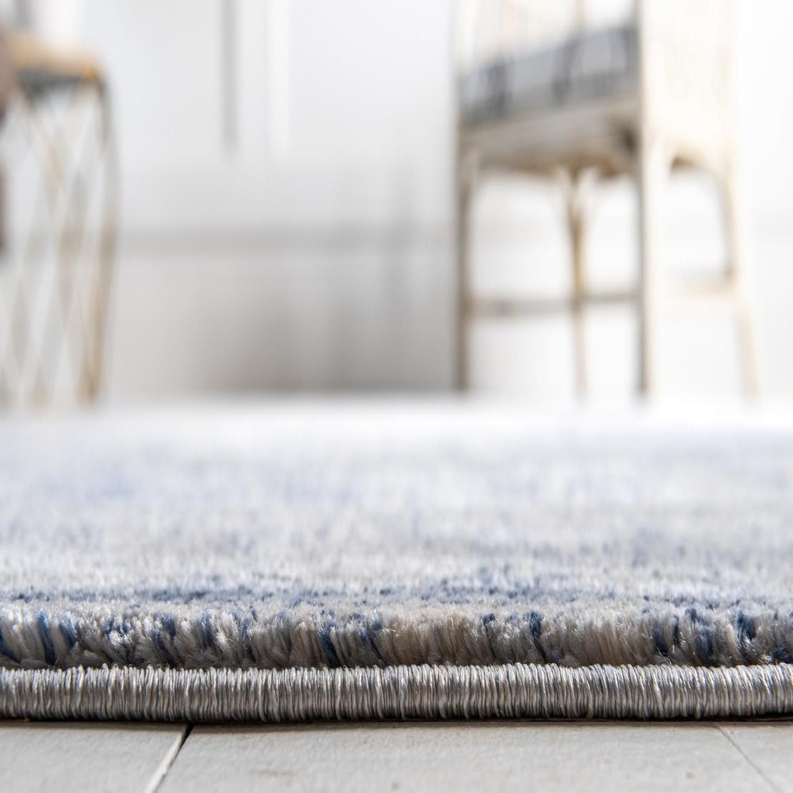 This rug fits easily into several decor directions: place it beneath a round dining table to define the area in a coastal or transitional dining room, use it in a seating arrangement with light wood furniture and neutral upholstery for a modern farmhouse look, or layer it in a bedroom with navy accents and brass or matte-black fixtures for a pulled-together, classic feel. Its muted palette also pairs well with gray sofas, beige linens, and mixed-metal accessories to create a calm, curated space.