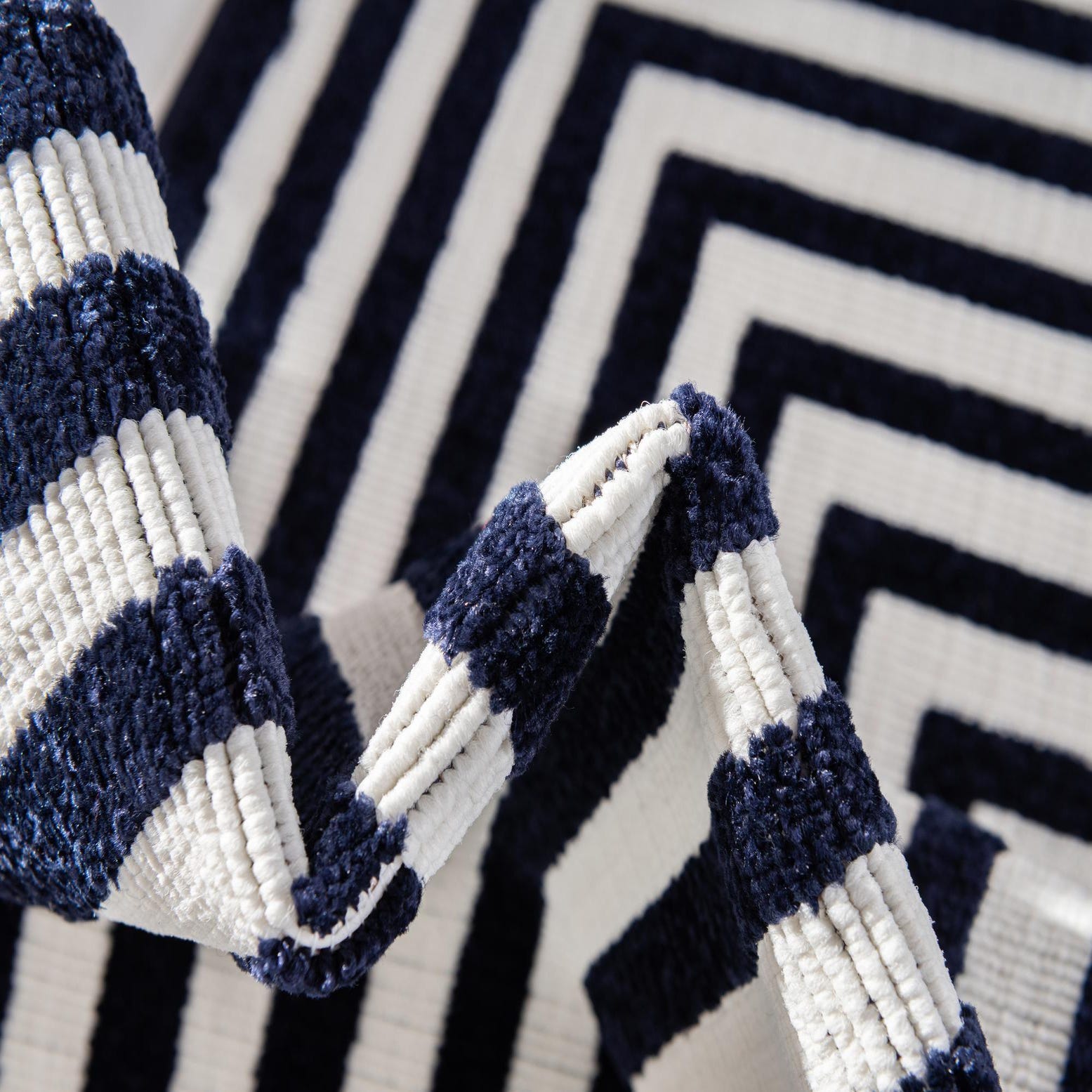 This piece works well in coastal, contemporary, or transitional settings. Place it under a round dining table or bistro set to define an outdoor seating area, layer it on a covered porch to anchor rattan or teak furniture, or use it in a bright sunroom to introduce bold contrast against light walls and natural wood tones. Navy and ivory pair naturally with white-painted furnishings, brass or matte black accents, and woven textures for a balanced, put-together look.