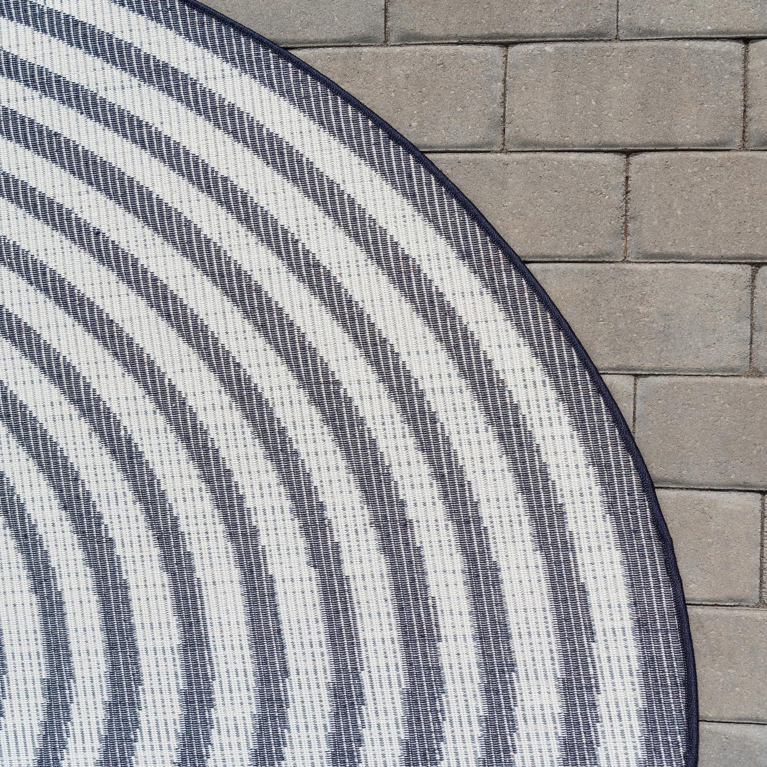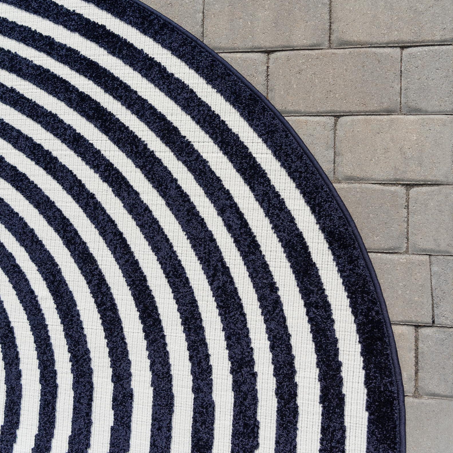 A round 8' navy blue and white striped modern rug with concentric circles, suitable for indoor or outdoor use.