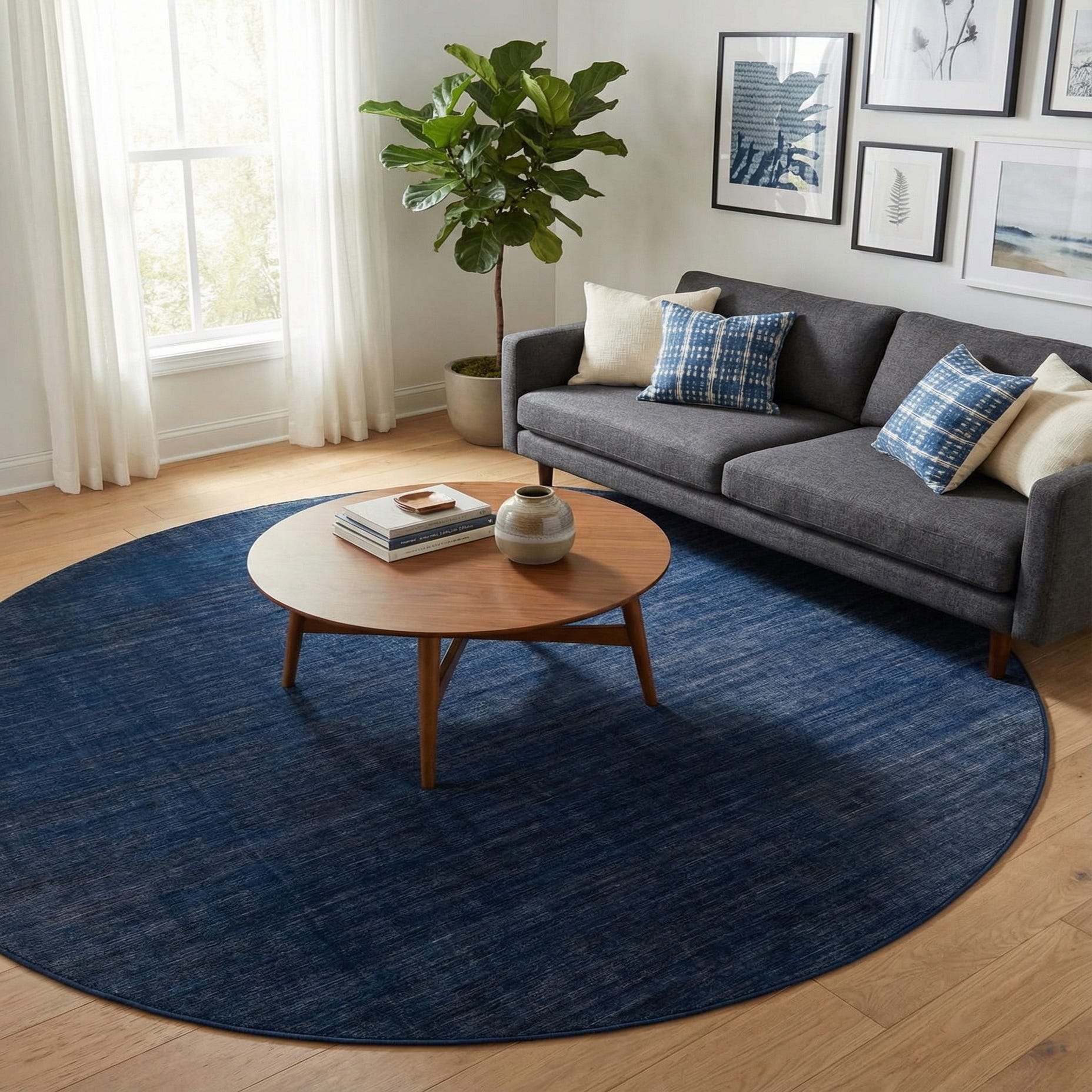 A deep navy blue field anchors this round rug, interrupted only by subtle, horizontal striations that add tonal depth and a soft, woven appearance. The overall effect is clean and modern with a hint of texture—minimal patterning that complements rather than competes with surrounding furnishings. The finished edge is neat and low-profile, keeping the focus on the rich navy surface.