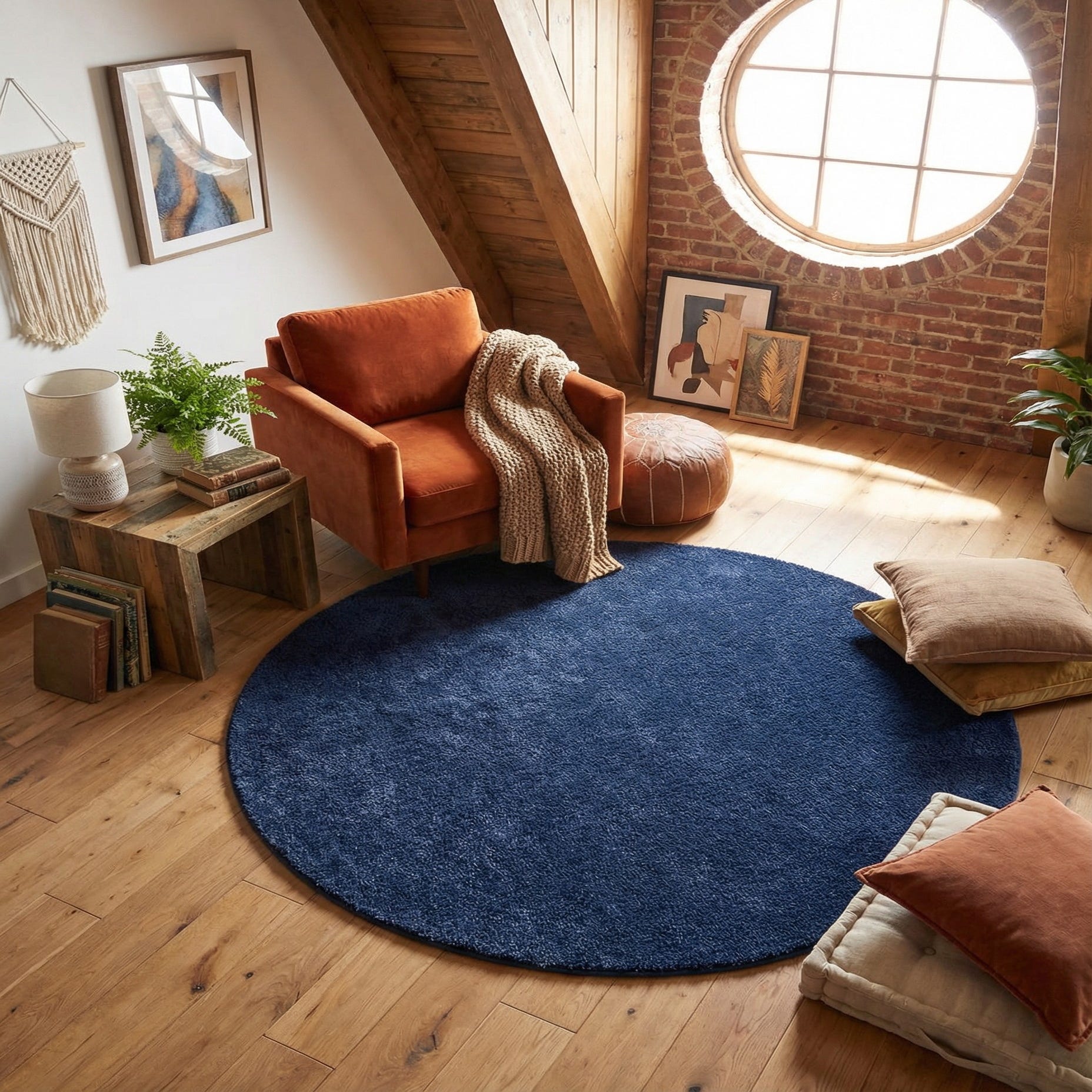 This round rug makes a bold statement with its rich navy hue, which can serve as an anchor for a variety of interior design themes. It is well-suited for contemporary spaces that utilize monochromatic schemes or nautical-inspired decors seeking a touch of marine elegance. The simplicity of the color and the textured finish can effortlessly complement minimalist styles or can be paired with vibrant furnishings to create a contrasting focal point in a room. Thanks to its durable construction, this rug is suitable for areas with moderate foot traffic, including living rooms, home offices, or under dining tables.