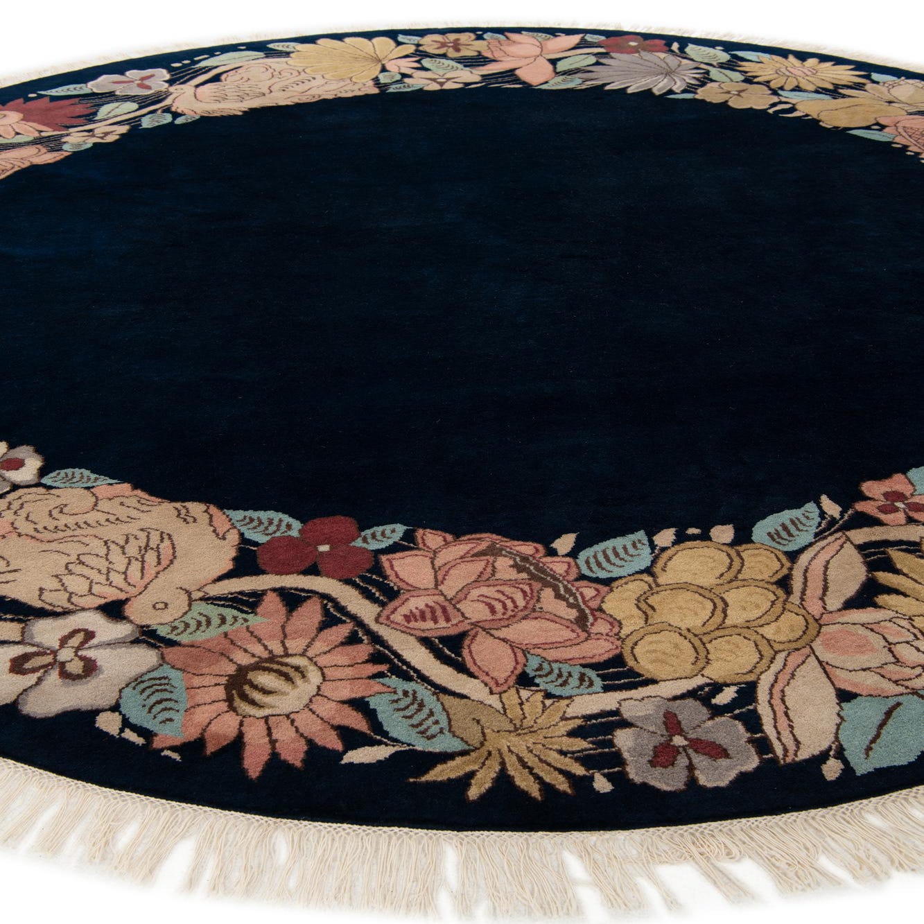 A round navy blue wool rug with a vibrant border of colorful floral and bird patterns, featuring cream fringe.
