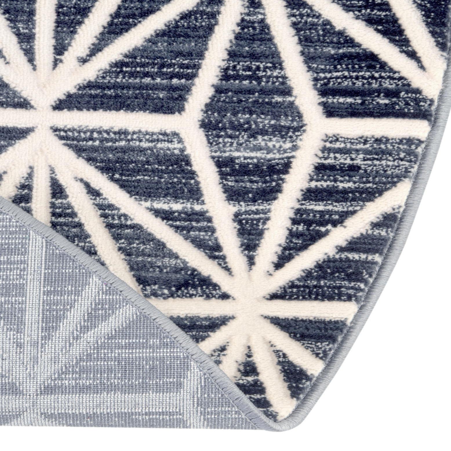 A round navy blue rug with a white geometric starburst pattern, suitable for a modern living room.